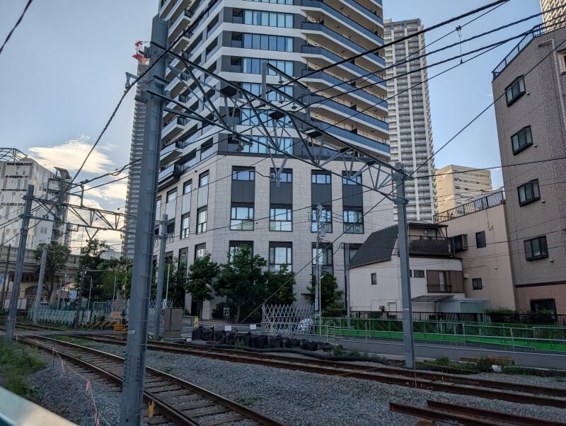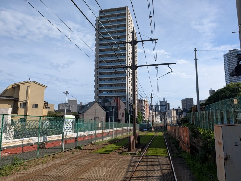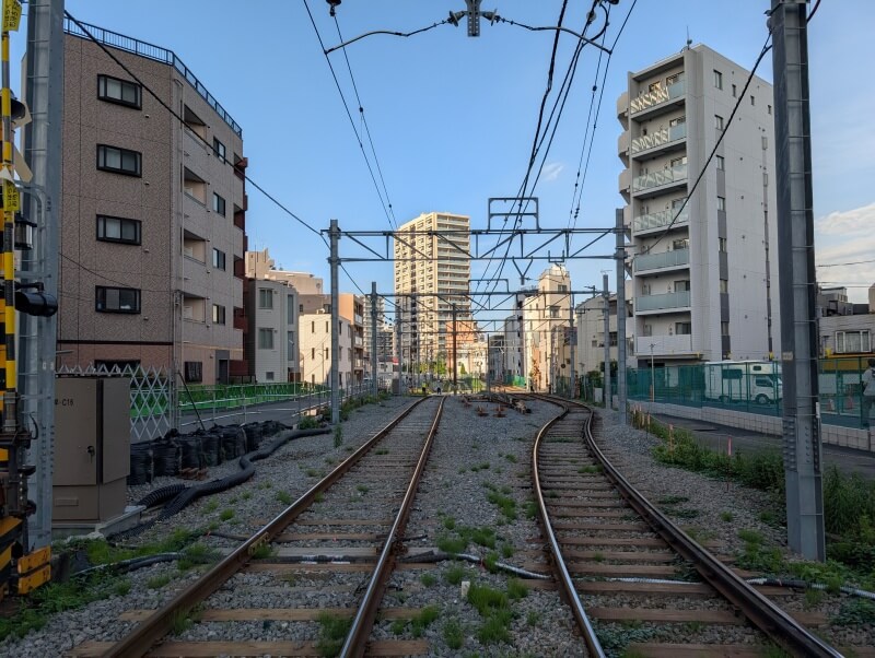 近くの線路から、都電荒川線の軌道の北側を見た様子です。軌道が東側に曲がっているので、移設工事が行われた形跡が見えました。
