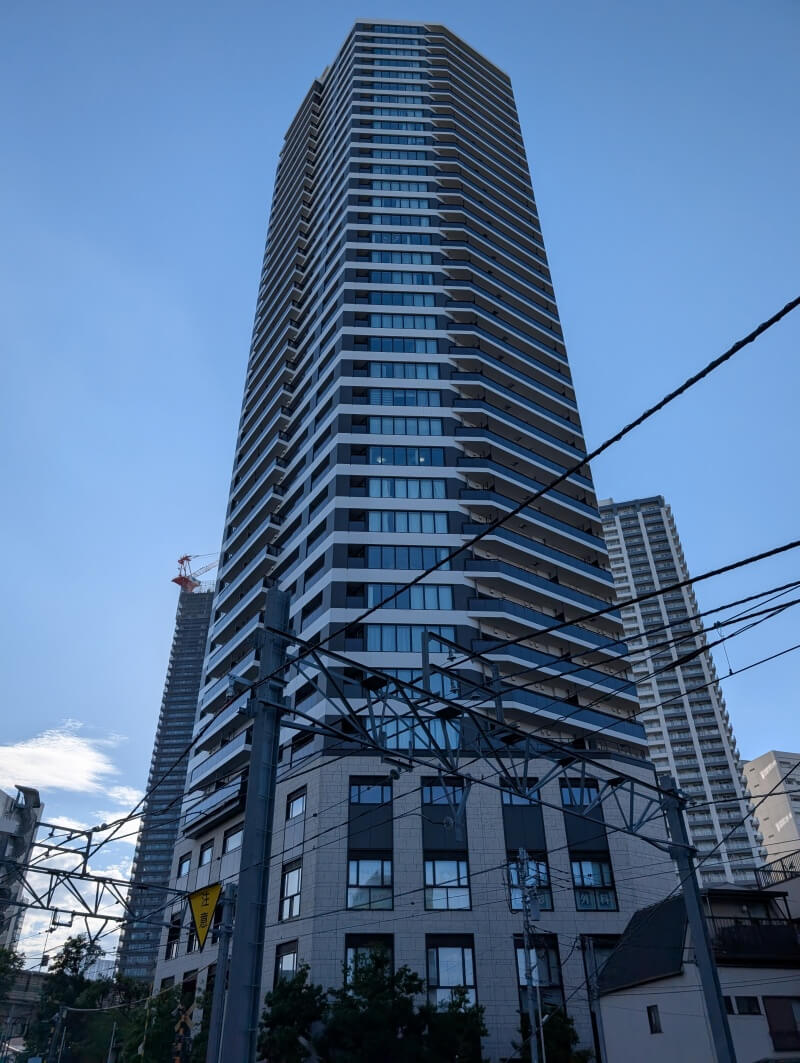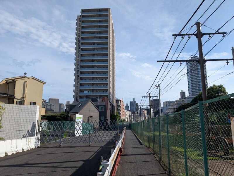 線路沿いに南へ進み、南側から「プラウドタワー東池袋」を見た様子です。