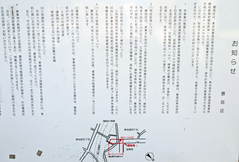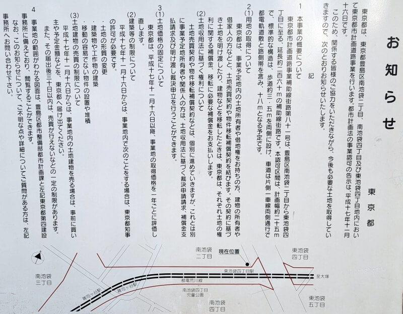 東池袋四丁目駅付近に掲示されていた、都市計画道路のお知らせです。