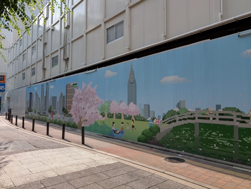 プラザ通り沿いの工事用のパネルには、ドット絵風の絵が掲示されていました。マインクラフトの画像にも似ている気がしました。