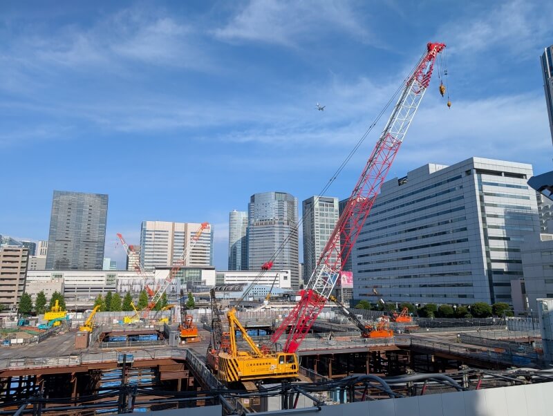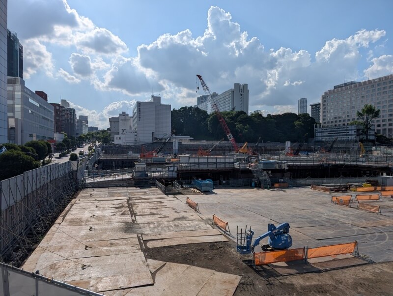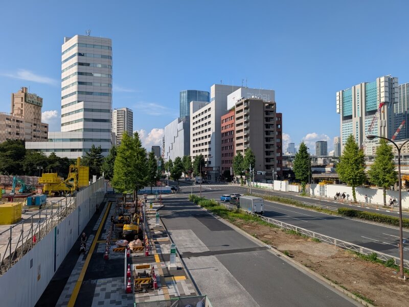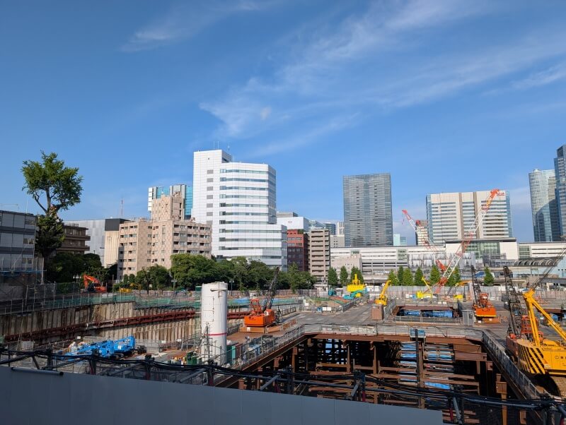 品川駅西口の歩道橋の上から、再開発の敷地の中を見た様子です。