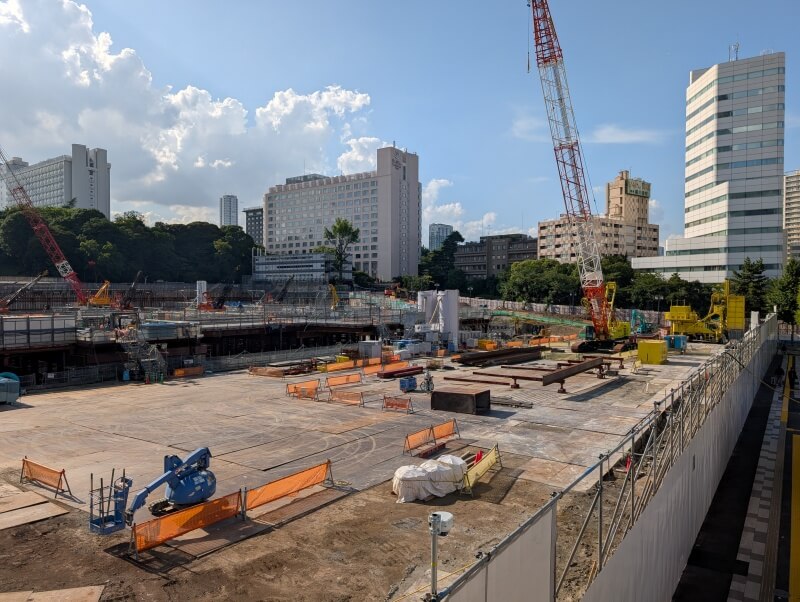 再開発の敷地の中の北側を、歩道橋の上から見た様子です。