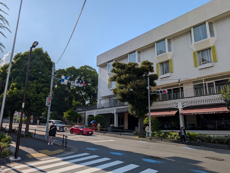 柘榴坂の上の方にある交差点から、建物の西側を見た様子です。