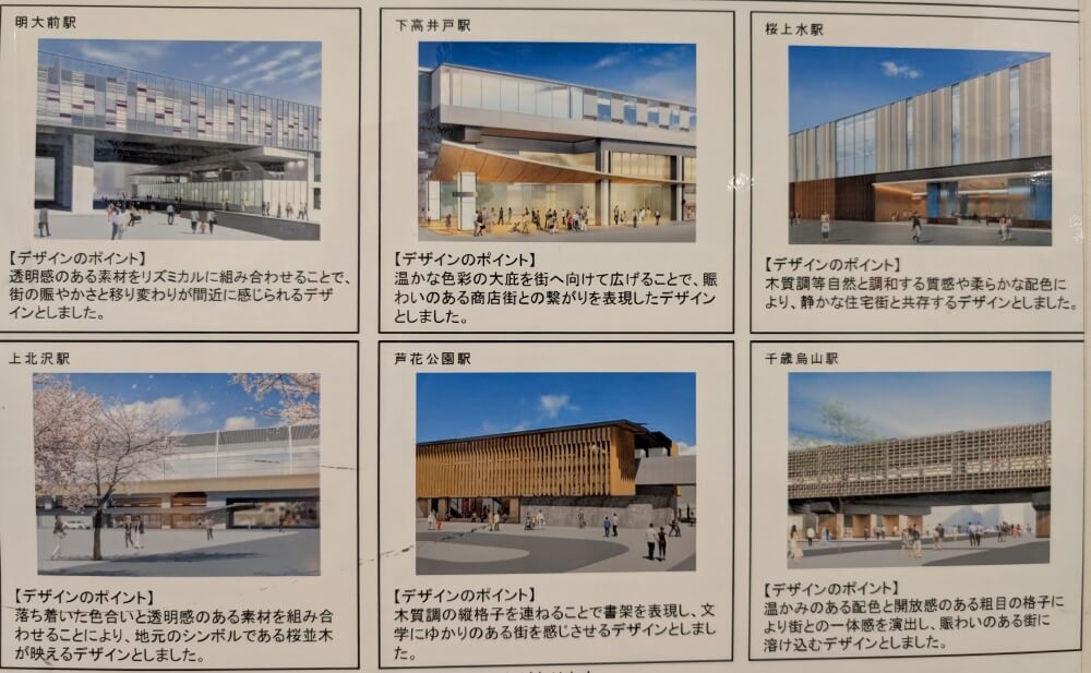 その他、明大前駅、下高井戸駅、桜上水駅、上北沢駅、芦花公園駅、千歳烏山駅のイメージ図も掲示されていました。