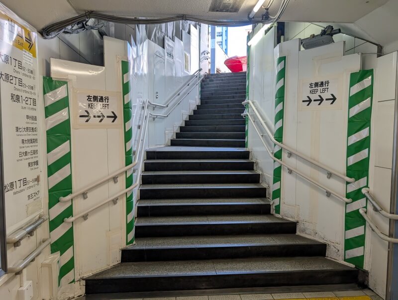 代田橋駅の北口に出る階段の様子です。こちらも工事で狭くなっていました。平日の通勤時とか混雑しないのか、心配になりました。