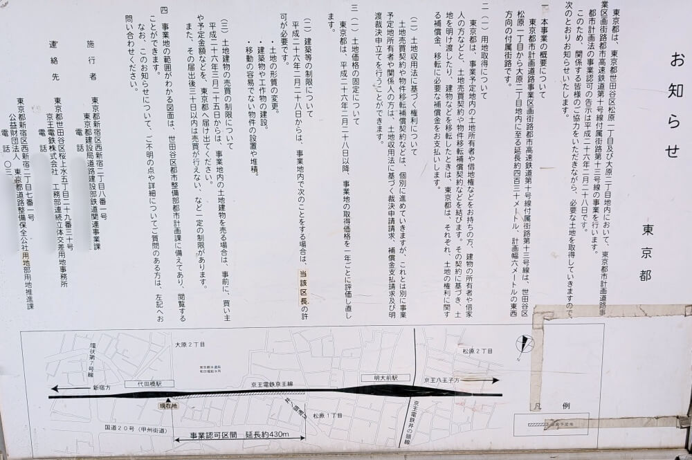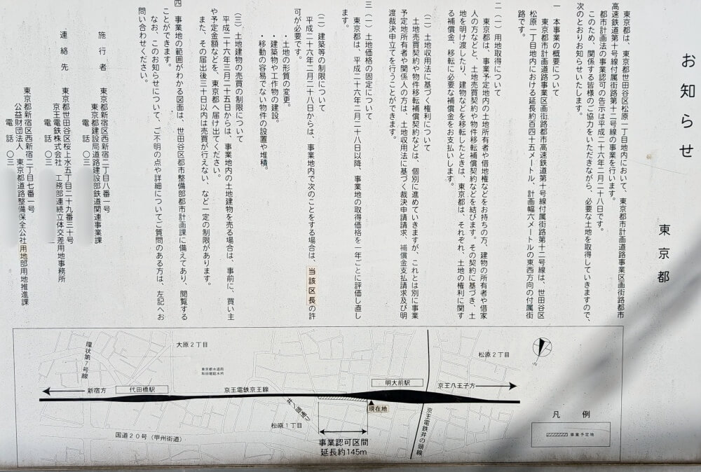 明大前駅傍には、笹塚駅~仙川駅までの連続立体交差事業のお知らせが、掲示されていました。