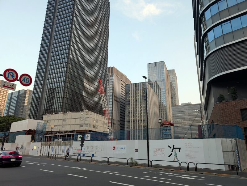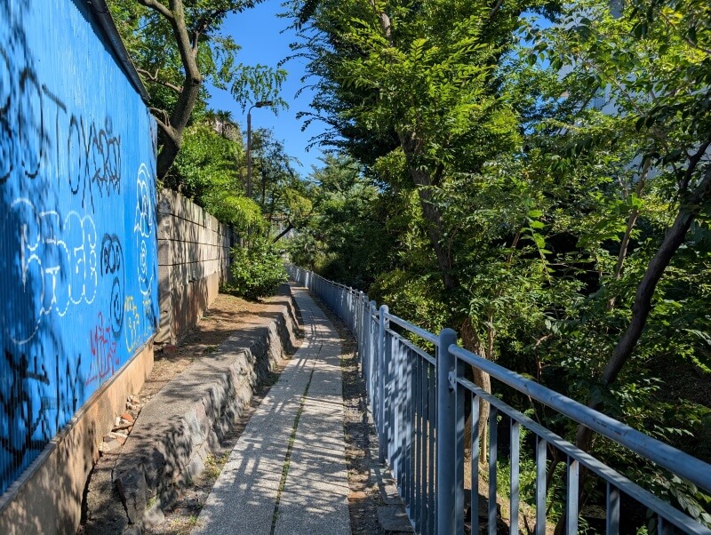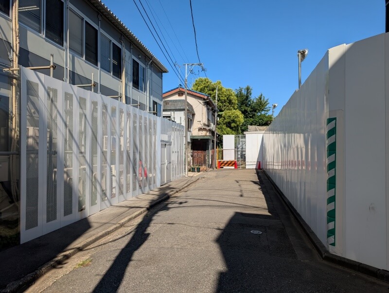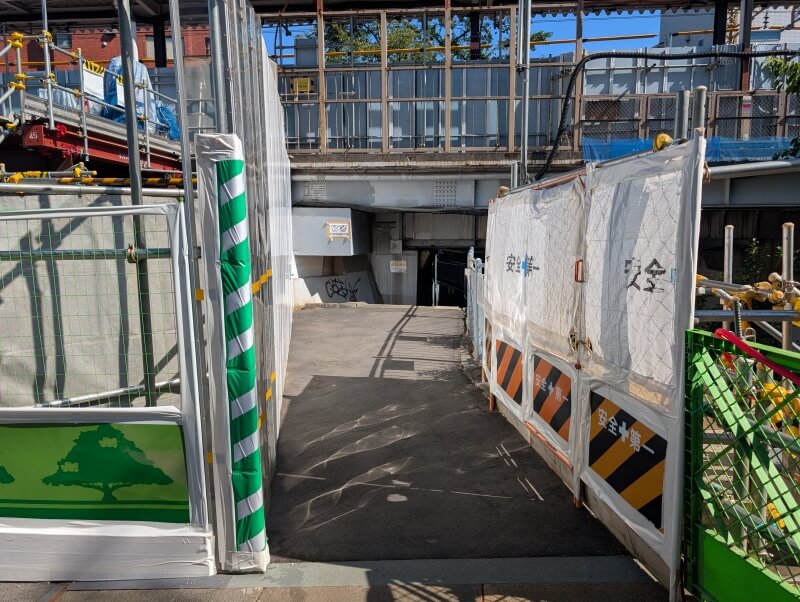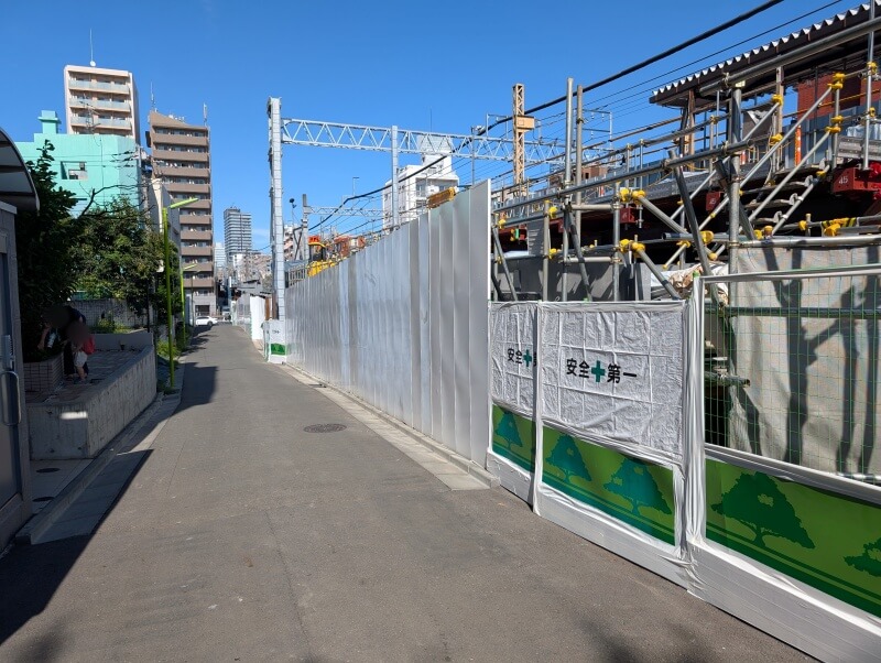 工事のパネル沿いに、環状七号線方面に行こうと、駅の北口から線路沿いに進んで行った様子です。先ほどのエレベーターが見えていました。