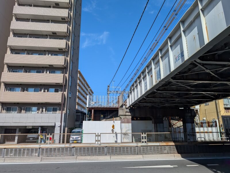 代田橋8号踏切の西側の、高架橋の工事を見た様子です。