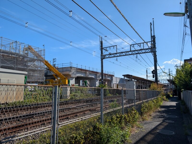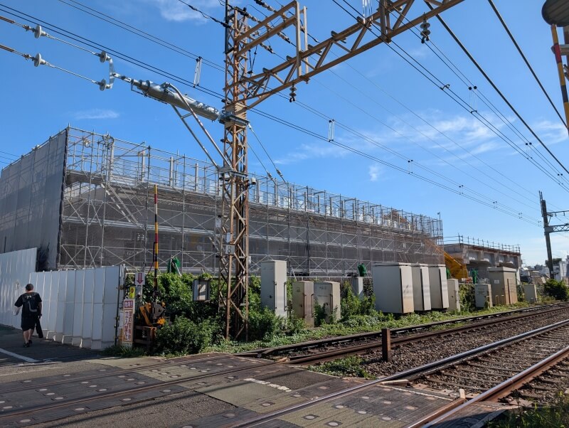 代田橋7号踏切の北側から、線路西側沿いで建設中の鉄道橋を見た様子です。