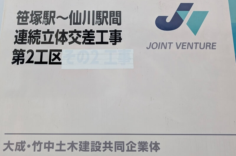 通路の途中には、笹塚駅~仙川駅間連続立体交差事業第2工区と、工事の名称が掲示されていました。第2工区は、大成・竹中土木建設共同企業体が工事を行っているようです。