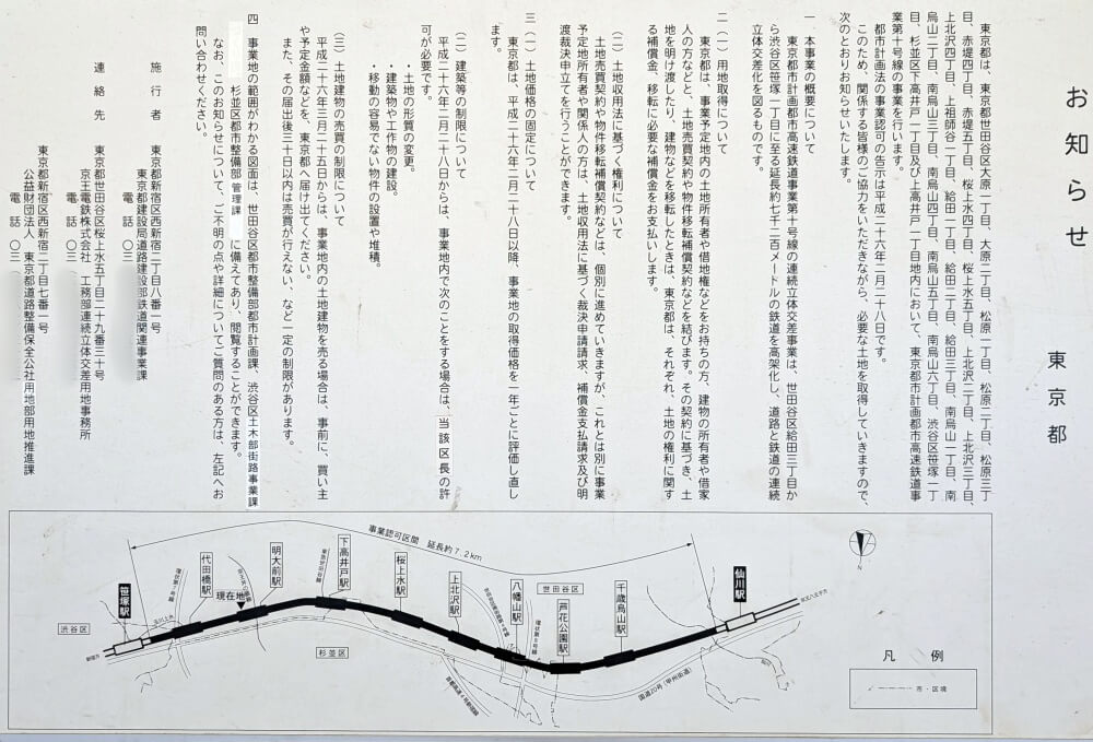 現地に掲示されていた、連続立体交差事業の工事のお知らせです。
