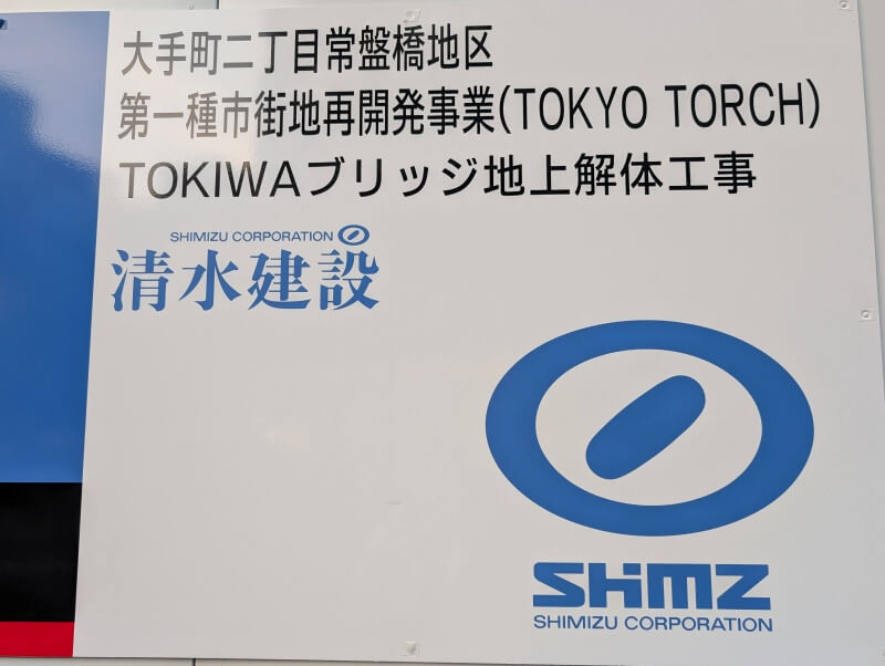 解体工事中の看板です。「大手町二丁目常盤橋地区第一種市街地再開発事業(TOKYO TORCH)TOKIWAブリッジ地上解体工事」と書かれていました。