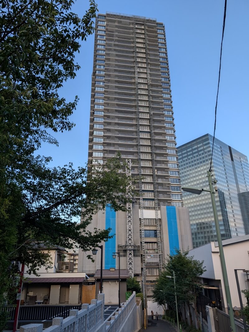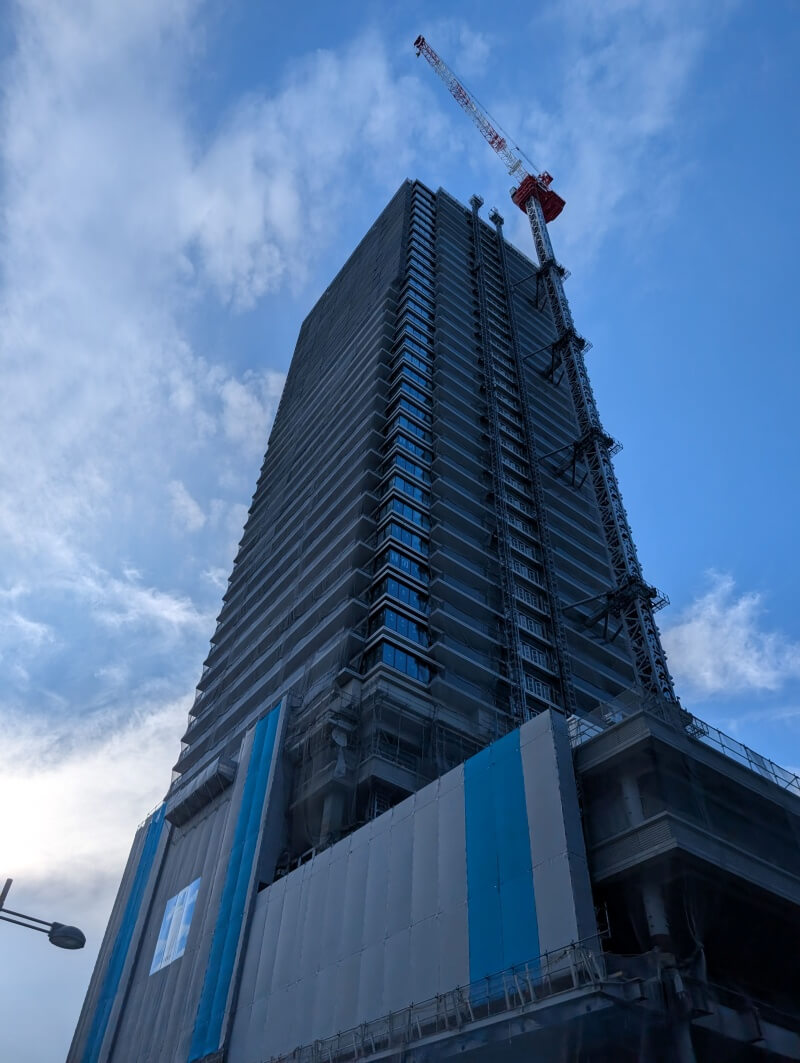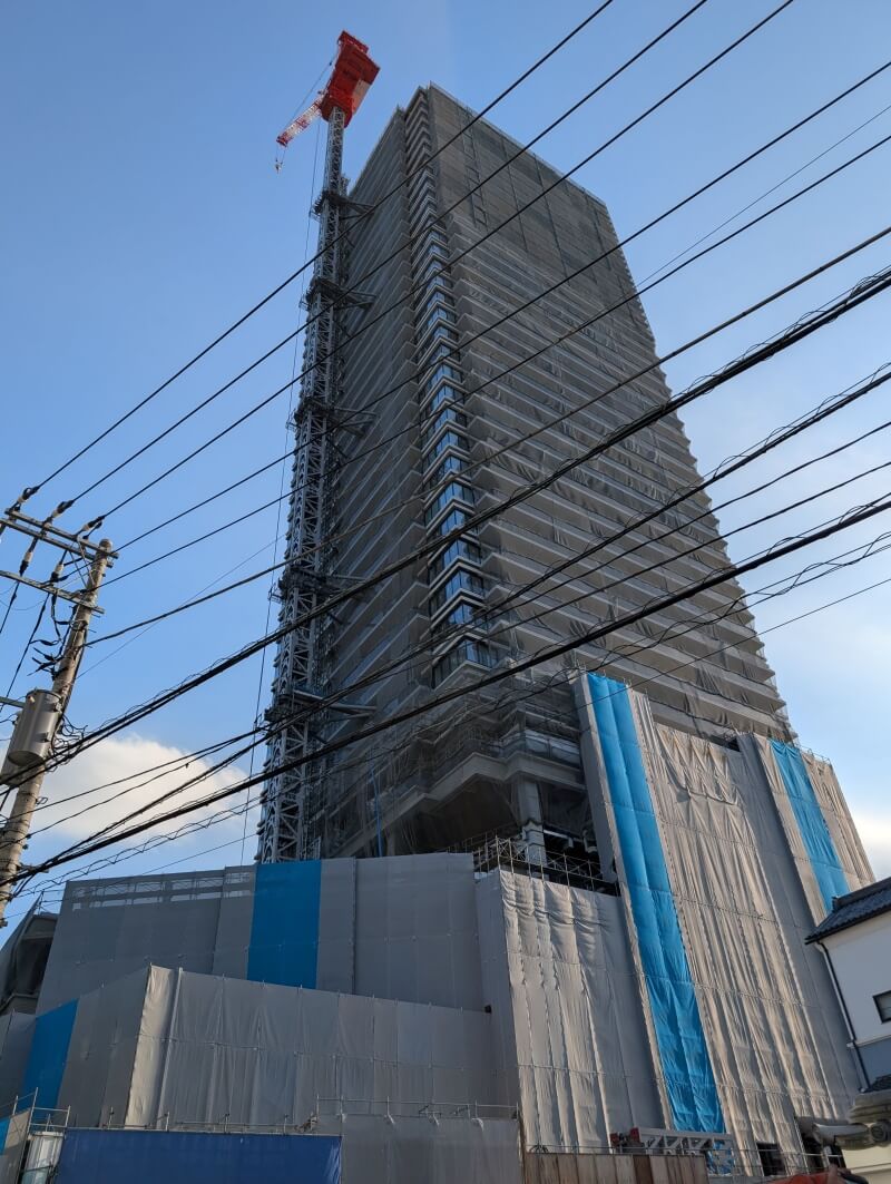 居木神社傍で再開発中の、37階143m「大崎駅西口F南地区第一種市街地再開発事業」の様子です。こちらは最高階の37階まで到達していました。ルーフトップ部分の施工を行っている感じでしょうか。