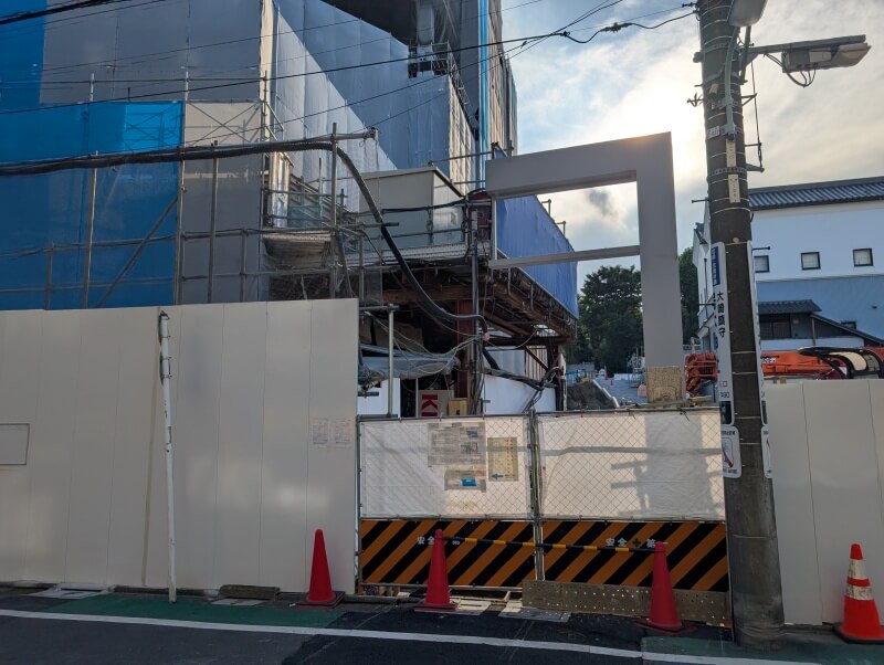 居木神社の参道入口を見た様子です。昔の赤い鳥居の入口ではなく、モダンな仕上がりの鳥居が施工中でした。