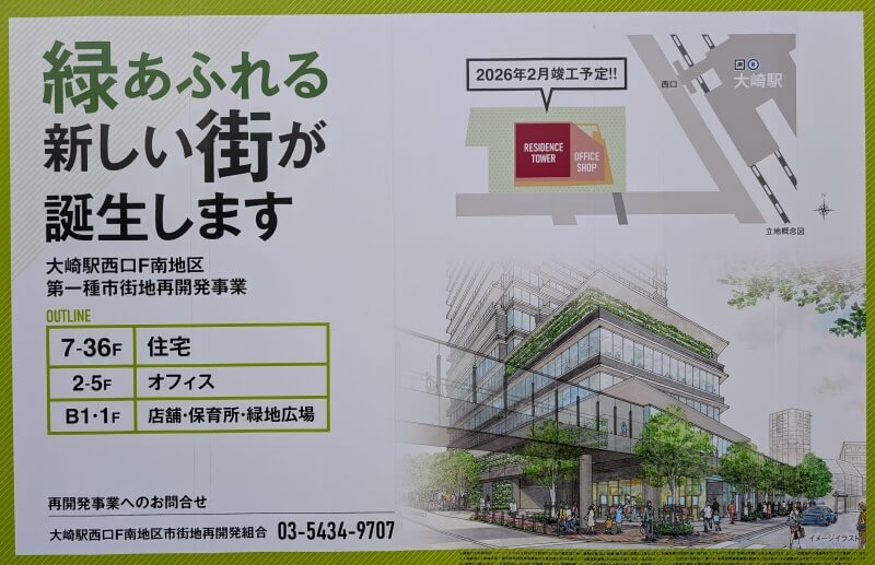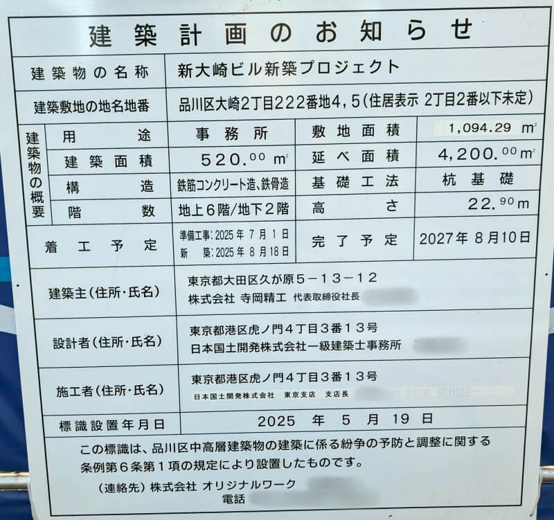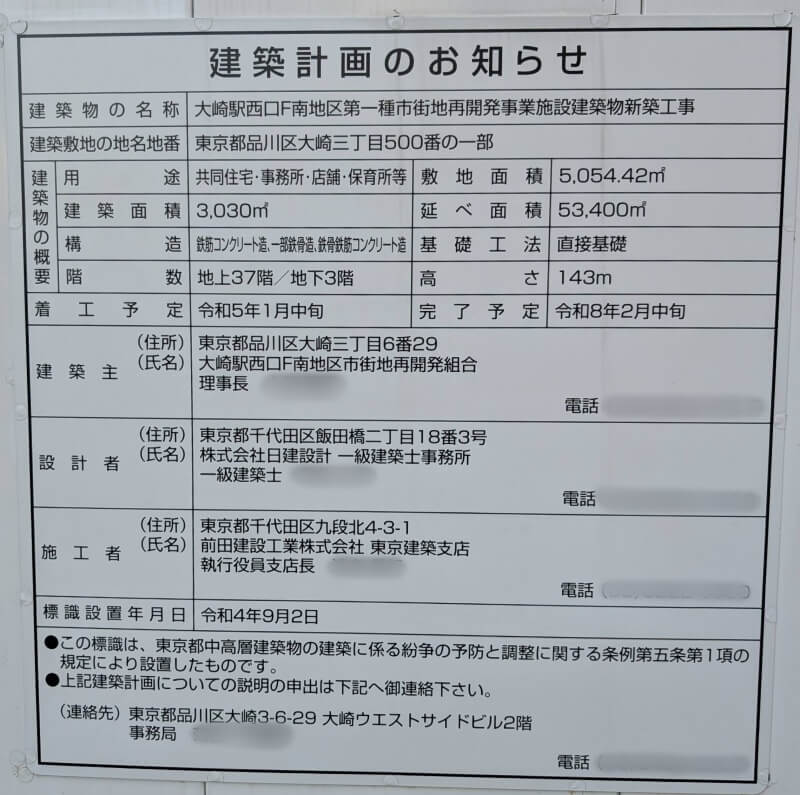 「大崎駅西口F南地区第一種市街地再開発事業」の南西側の敷地に、建築計画のお知らせが掲示されていました。