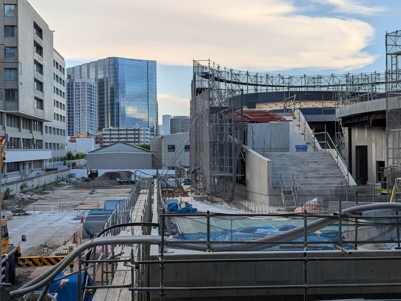 東側から、施工中の建物を見た様子です。写真の手前の建物が、「OIMACHI TRACKS HOTEL & RESIDENCE TOWER」となります。