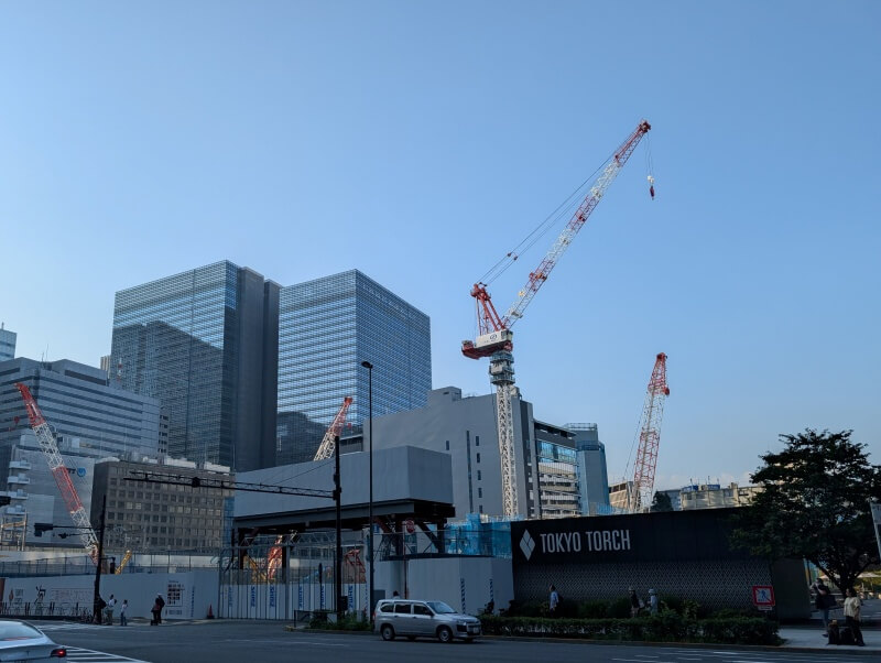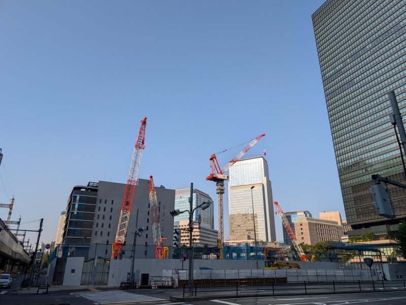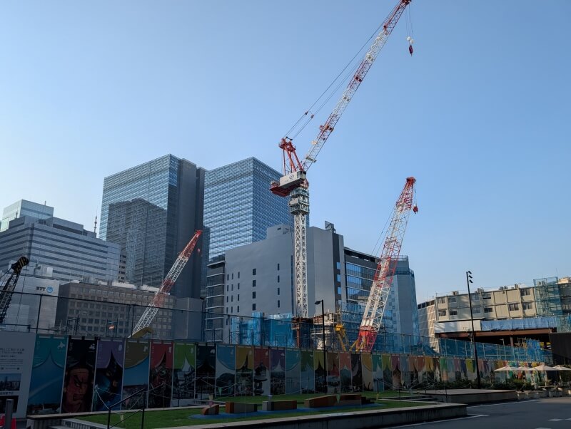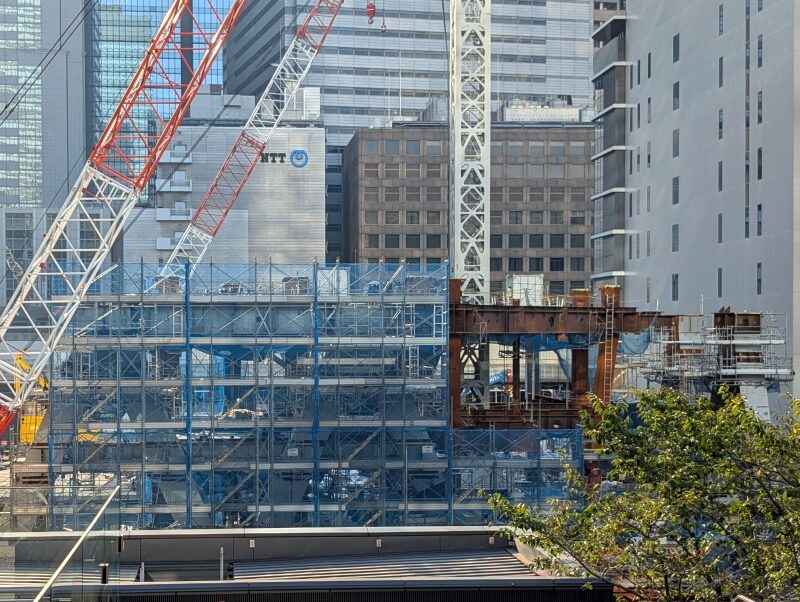 東京の日本橋口側から、再開発の敷地を見た様子です。タワークレーンの周囲に、地上部の鉄骨が出現していました。