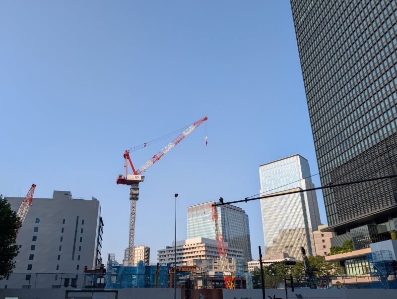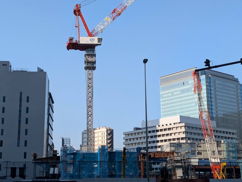 「常盤橋タワー」側から、タワークレーンと地上部の鉄骨付近を見た様子です。