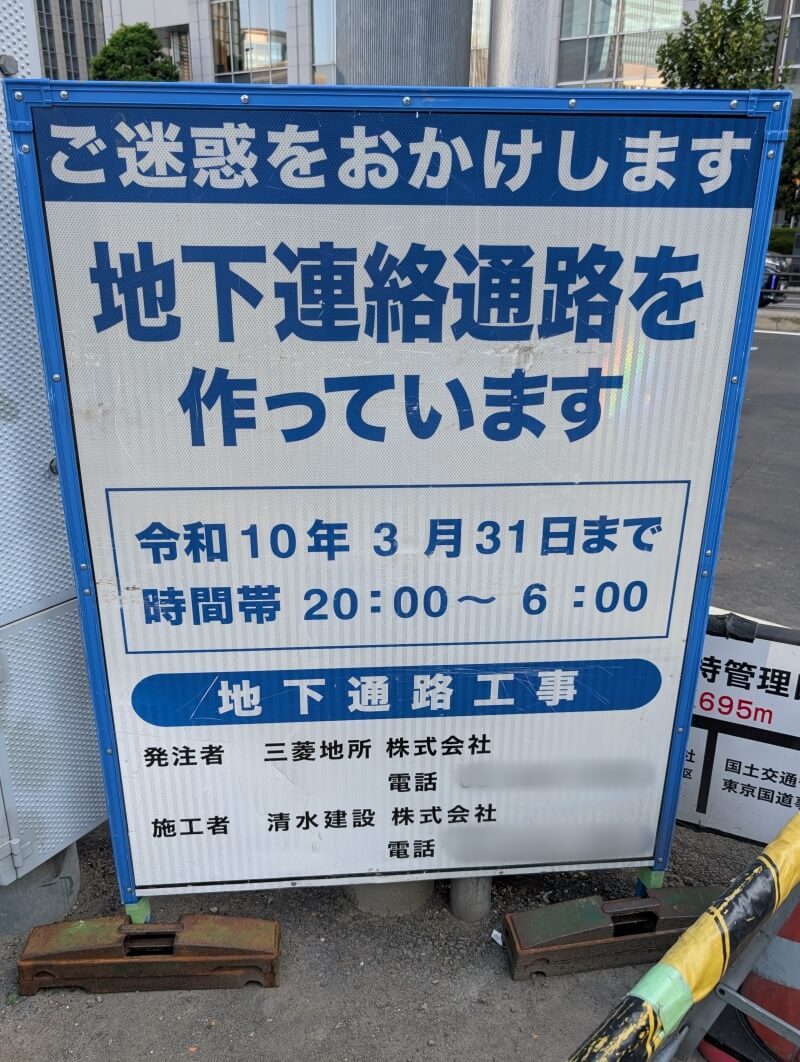 JRの高架付近では、地下通路連絡工事のお知らせが掲示されていました。令和10年の3月31日迄を予定しています。この工事により、大手町や丸の内側と日本橋側が、地下で繋がる予定です。