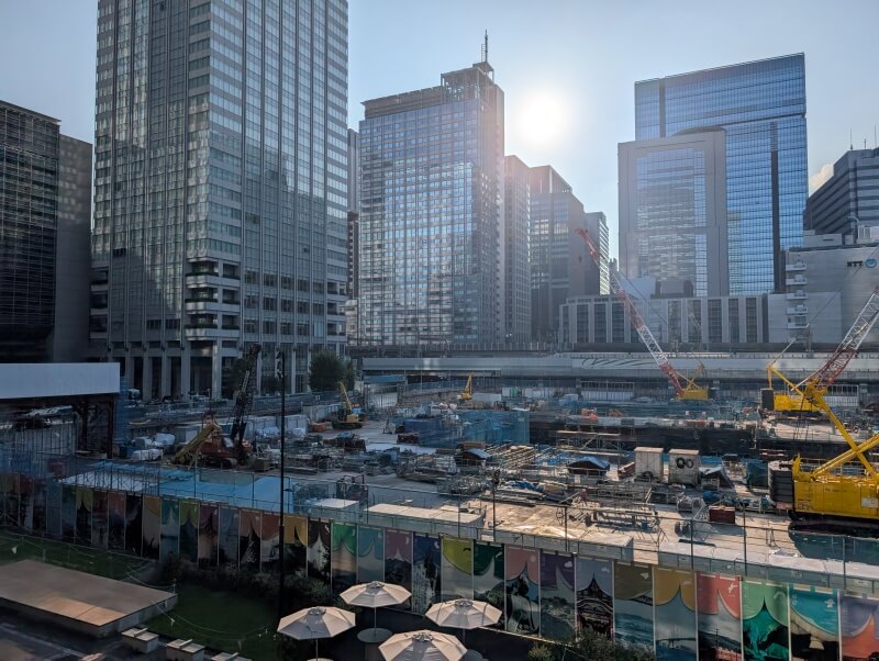 「常盤橋タワー2階」の、少し日陰になった場所から、施行中の地上部の鉄骨を見た様子です。