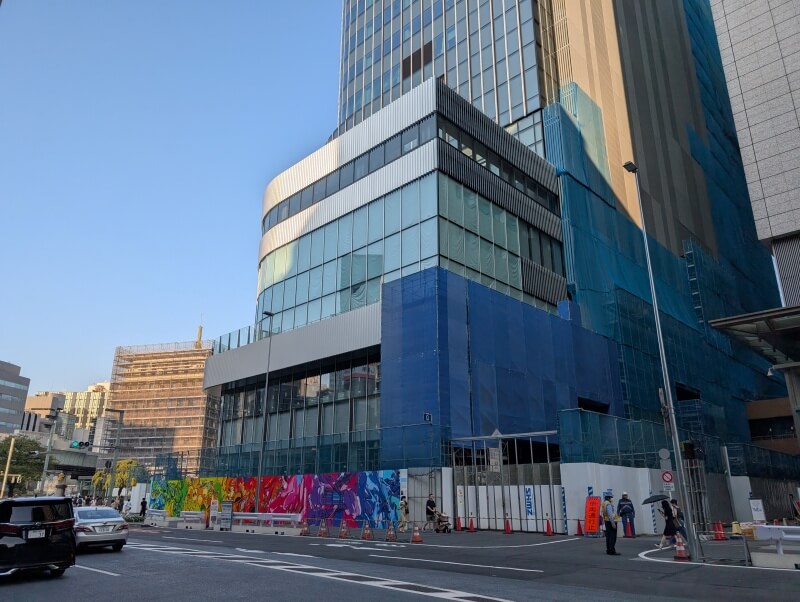 中央通り沿いの南側から低層階を見た様子です。低層階の躯体のカバーも取れてきており、建物が見えてきていました。工事用のフラットパネルにアートが描かれているのが良いなと思います。