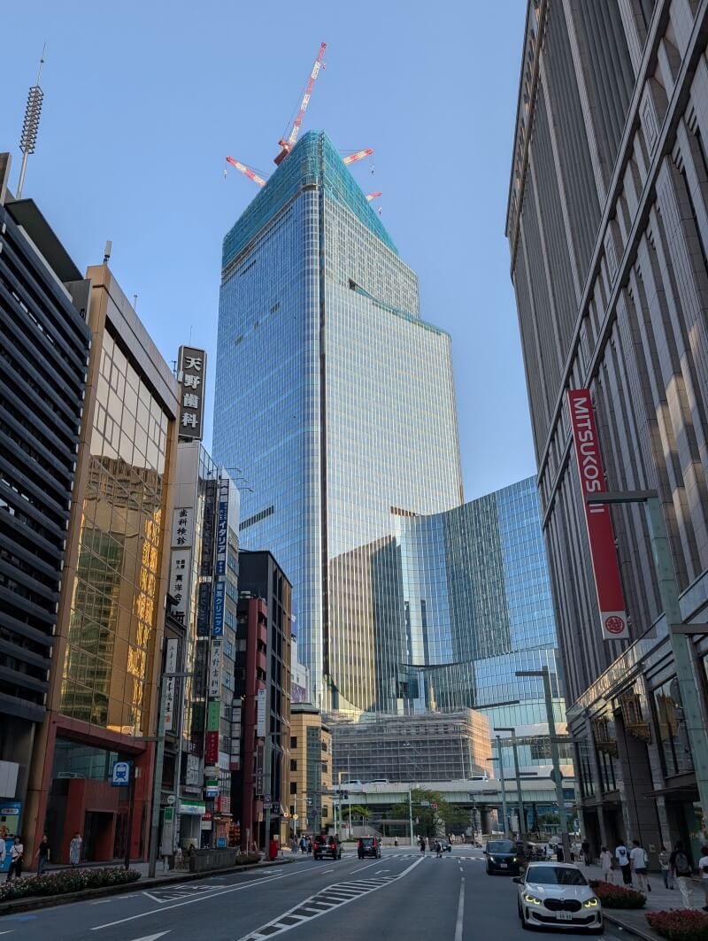 中央通りを北側に進み、日本橋三越前から建物を見た様子です。他の建物と一緒に写ると、建物の高さが分かるかと思いました。