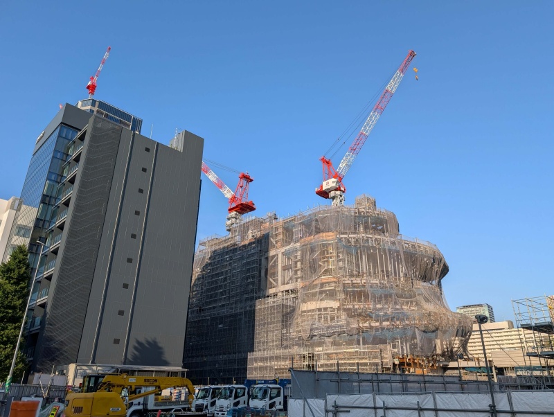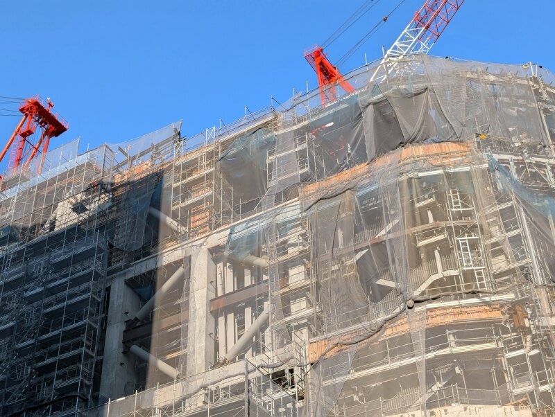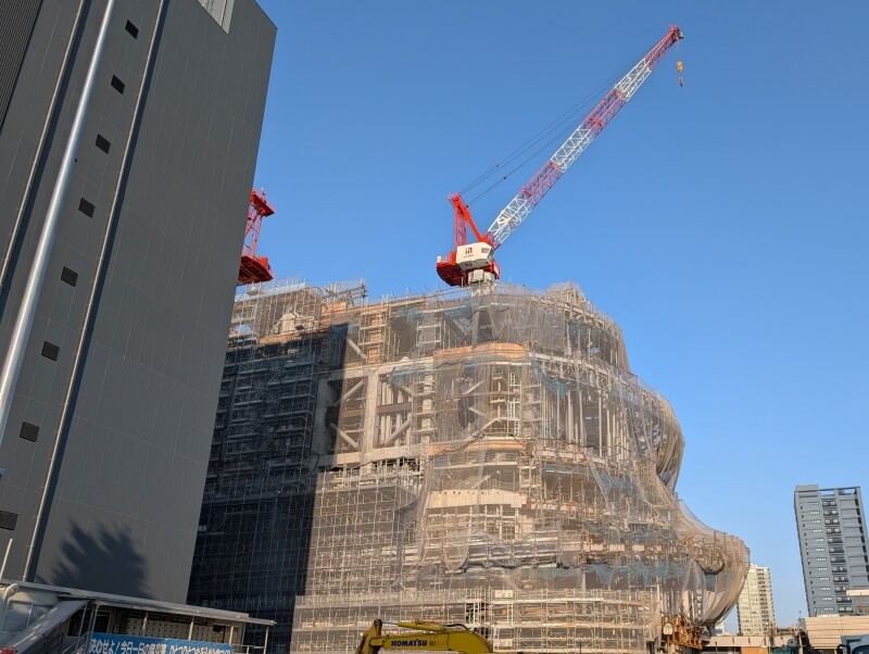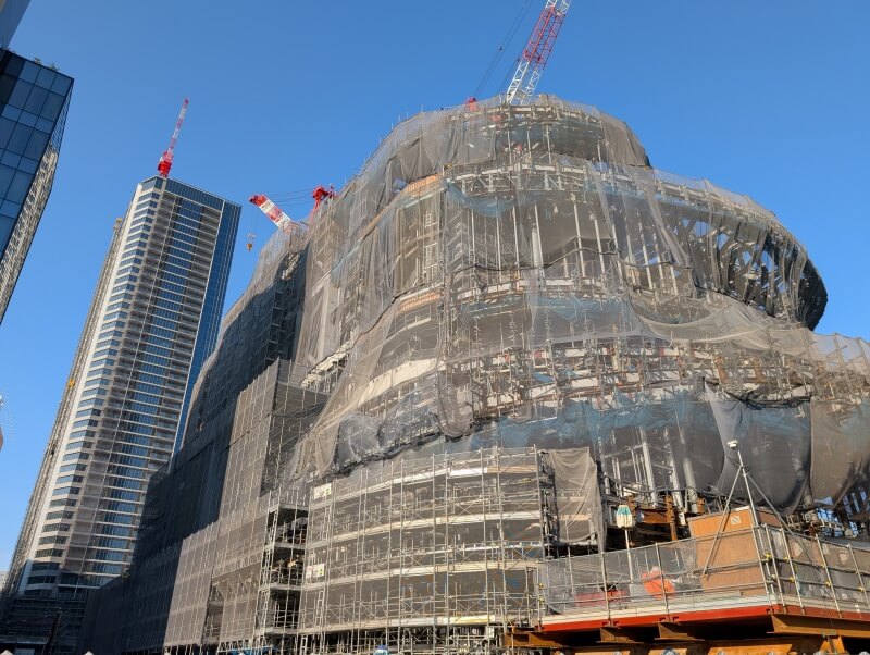 施工中の建物をズームして撮影した様子です。高輪ゲートウェイ駅と同じ、隈研吾氏のデザインで、木材を使用した躯体が施工中でした。