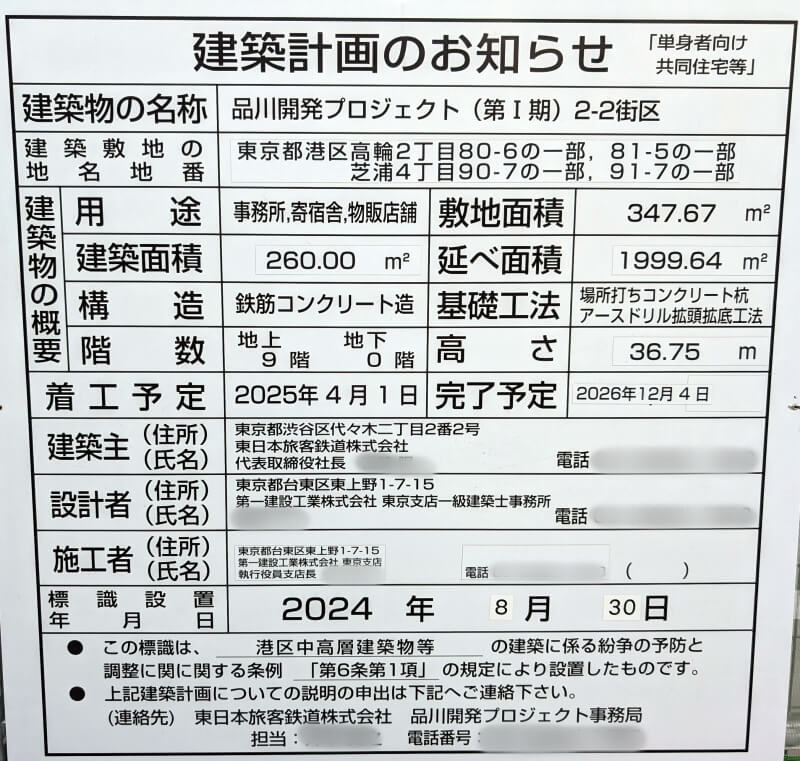 施工中の建物の傍に、建築計画のお知らせが掲示されていました。名称が、「品川開発プロジェクト(第Ⅰ期)2-2街区」となっていました。用途に寄宿舎と書いてあったので、これは文化創造棟とは別の建物の、建築計画のお知らせなのでしょうか?