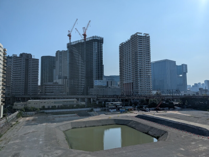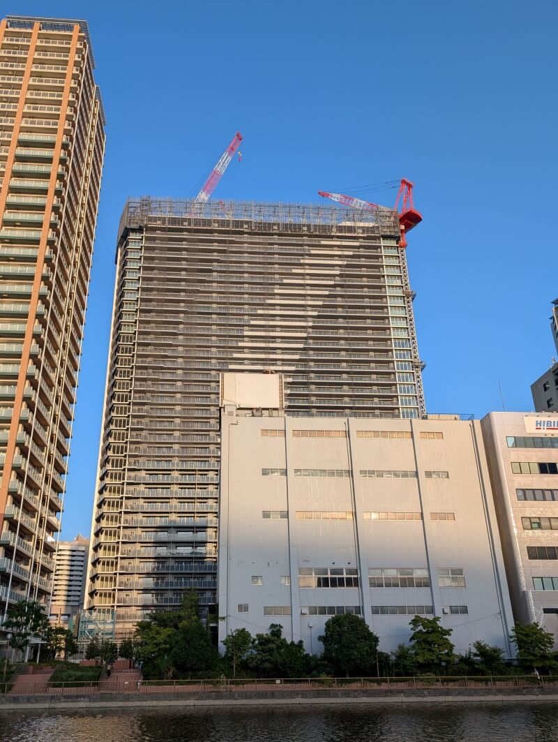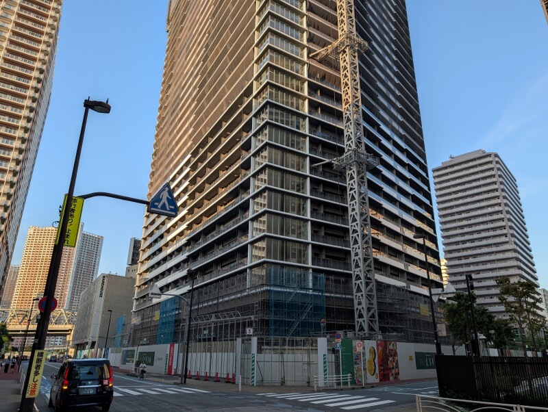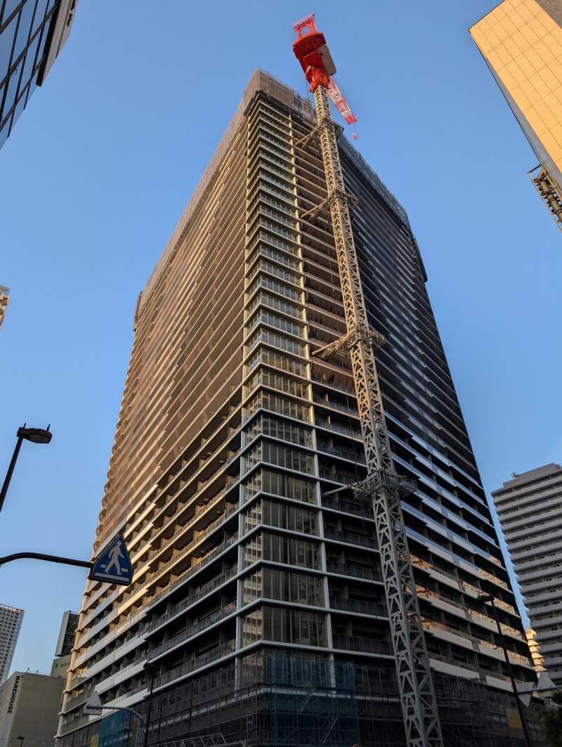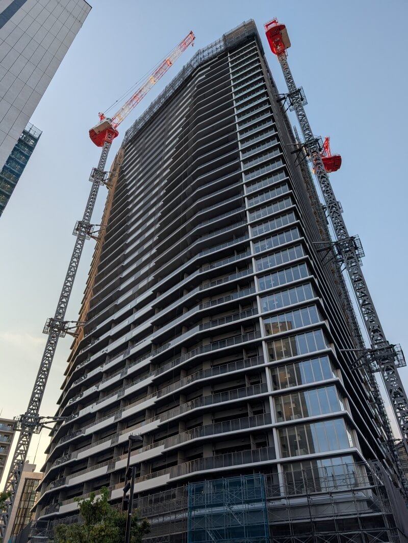 先ずは、高輪ゲートウェイシティから、施行中の「リビオタワー品川」を見た様子です。見た感じルーフトップ部分を施工中でしょうか?