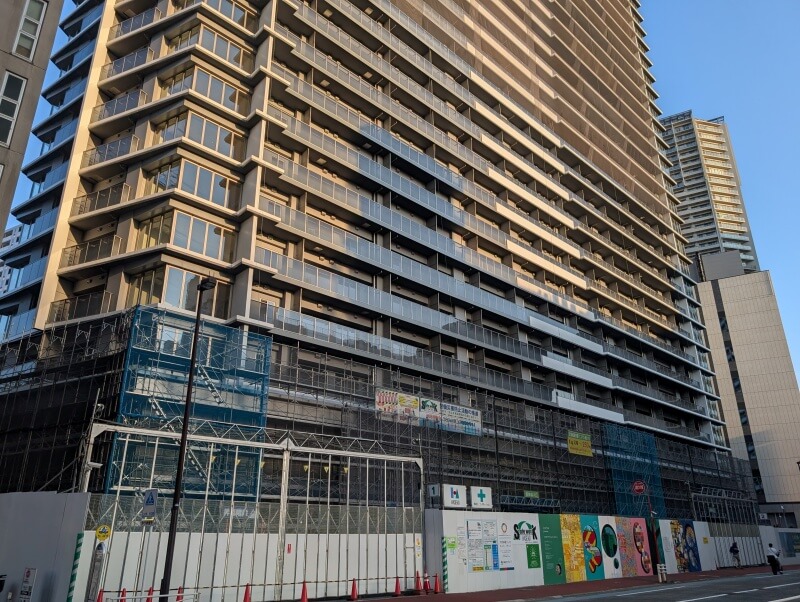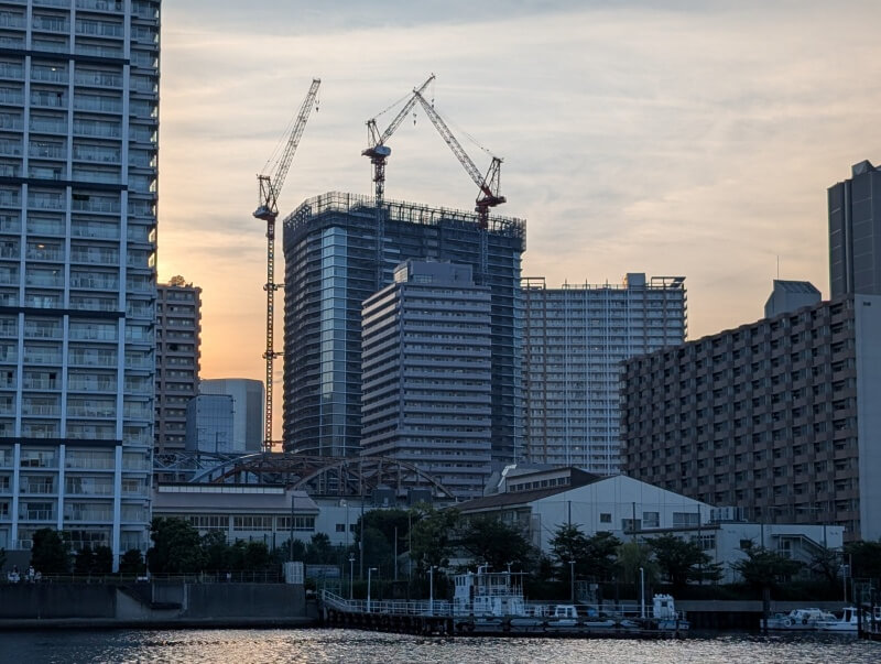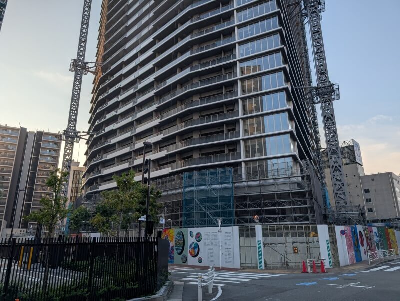 高浜運河沿いから、施行中の建物を見た様子です。他の場所を色々撮影していて、撮影時間が夕方になってしまったので、建物が夕日を浴びて赤くなっています。