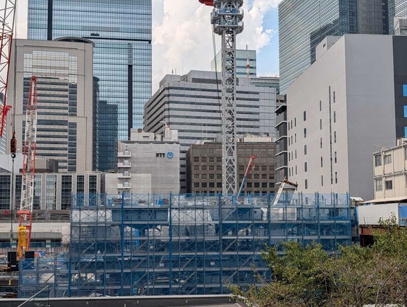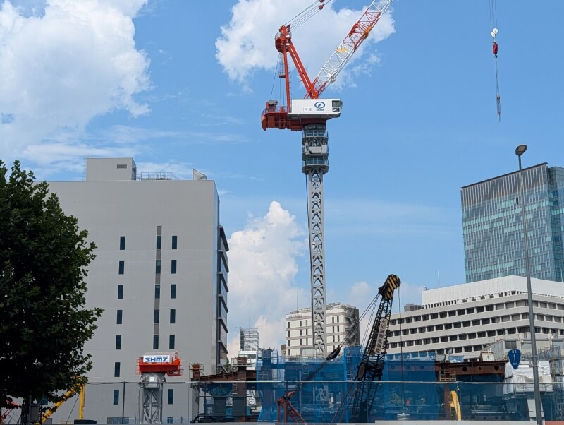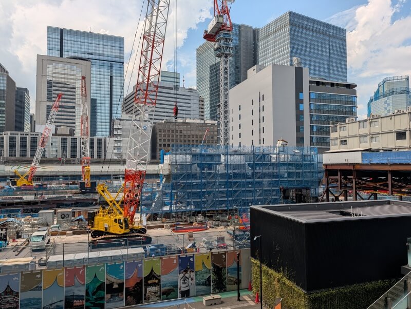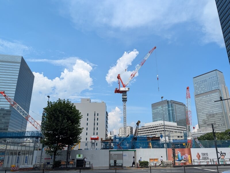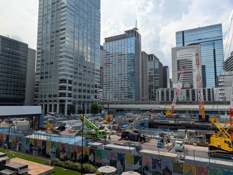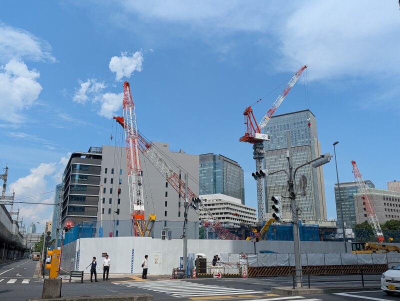 先ずは、東京駅日本橋口側から、施工中の敷地を見た様子です。1号基の西側に、2基目のタワークレーンの巻き上げ装置付近が見えていました。