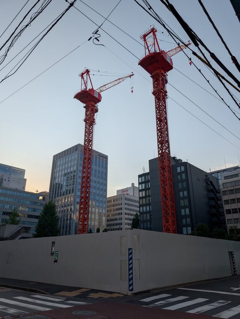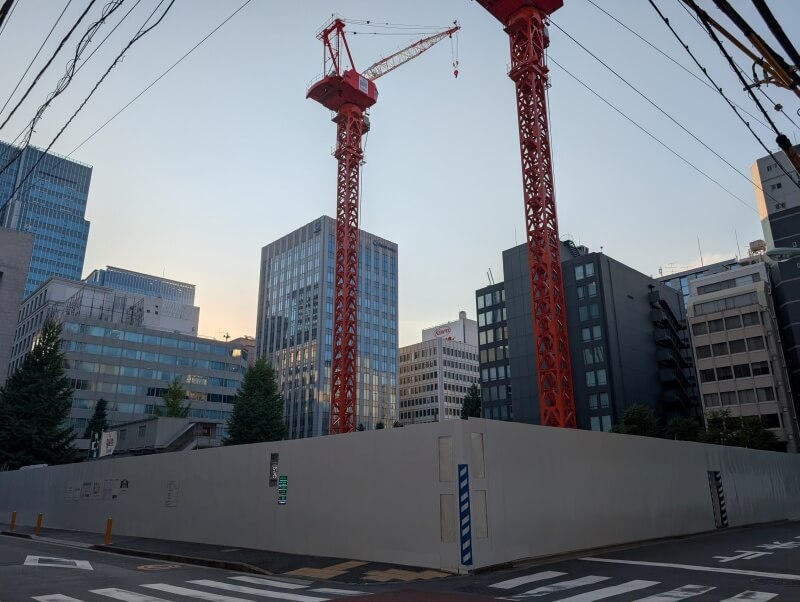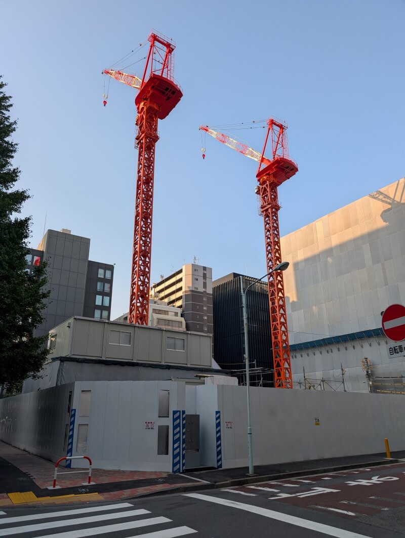 昭和通り沿いの南側から、17階81m「(仮称)野村不動産日本橋本町ビル計画」の敷地を見た様子です。2基のタワークレーンが出現していました。