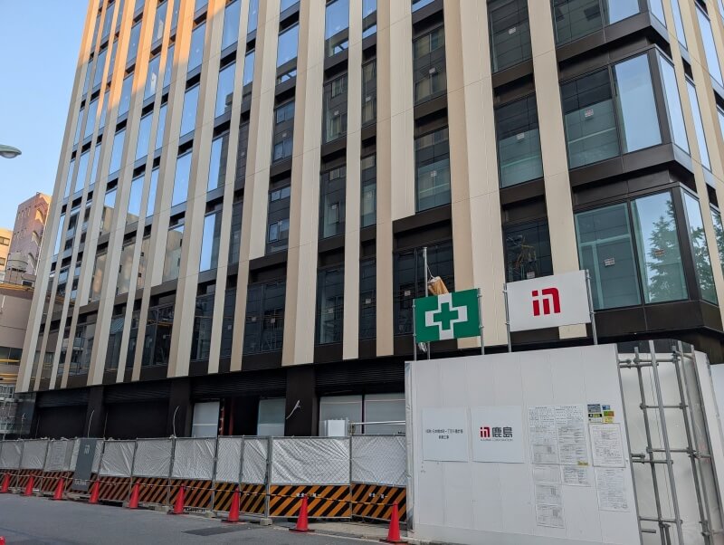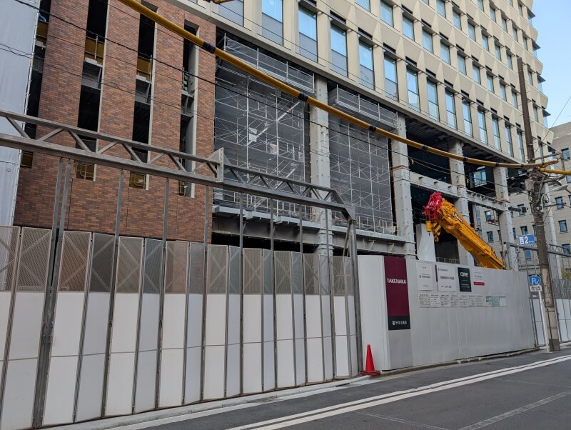 「(仮称)野村不動産日本橋本町ビル計画」の東側で施工中の、9階49.5m「(仮称)稲畑産業東京本社ビル建替計画」の様子を、旧日光街道沿いに見た様子です。