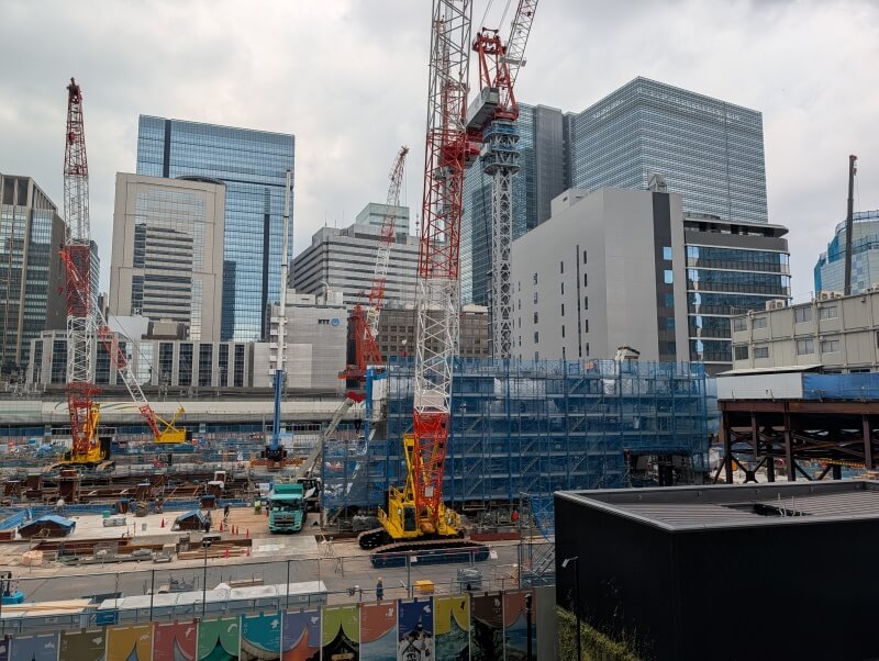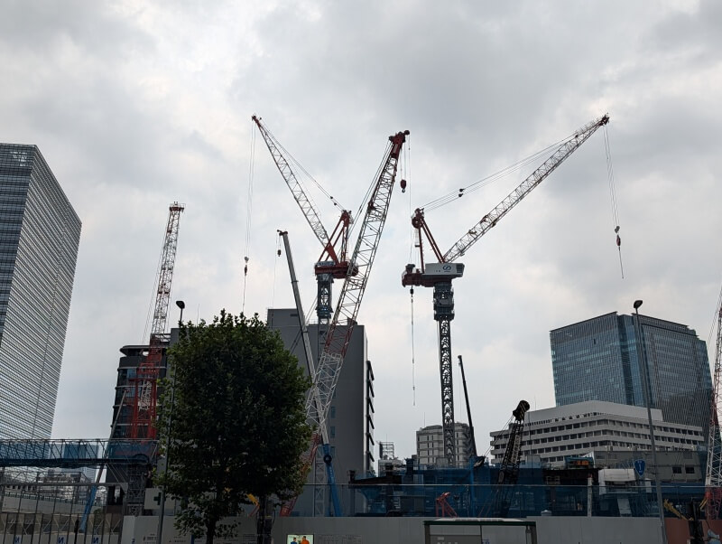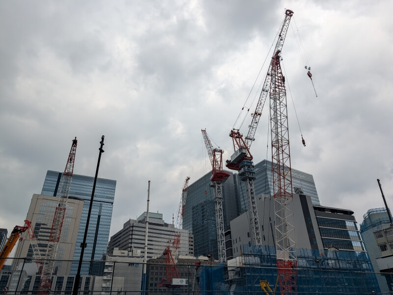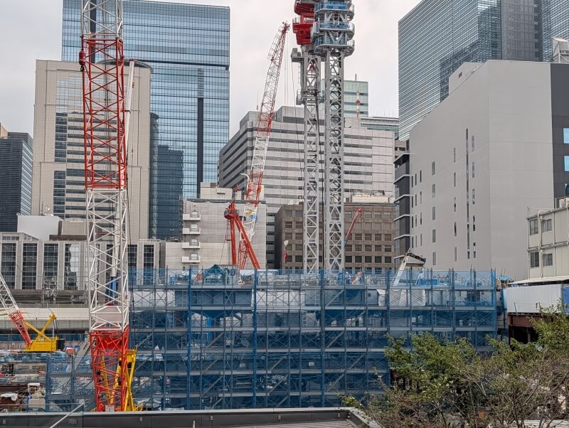 東側の「常盤橋タワー」との間の広場から、出現しているタワークレーンや地上部の鉄骨を見た様子です。