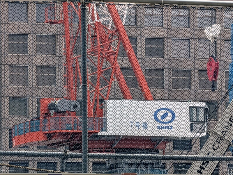 組立中の3基目のタワークレーンを、ズームして見た様子です。タワークレーンの運転室の脇には、7号機と描かれていました。という事は、タワークレーンは最低7基、こちらに出現する感じでしょうか。