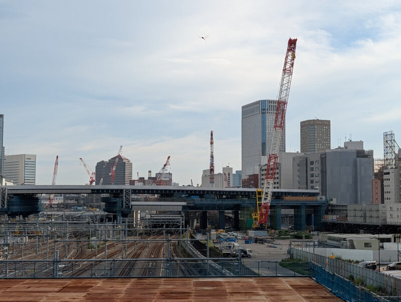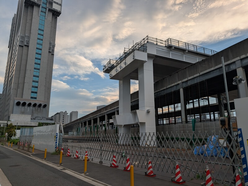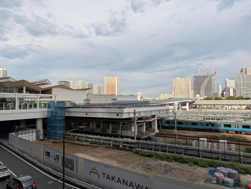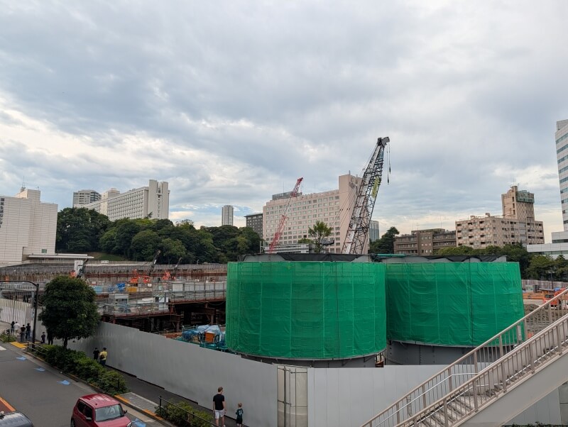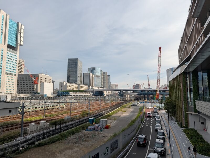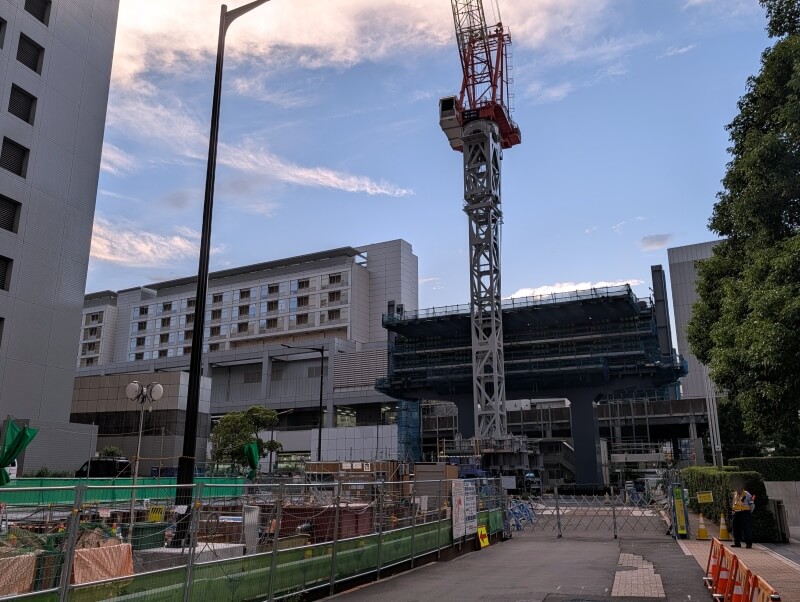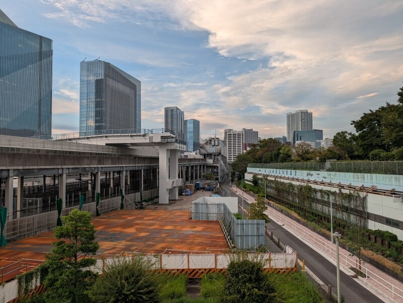高輪ゲートウェイ駅南西側を見た様子です。将来的に、高輪ゲートウェイ駅側から、環状第4号線(高輪~港南間)と、道路で繋がるようになります。