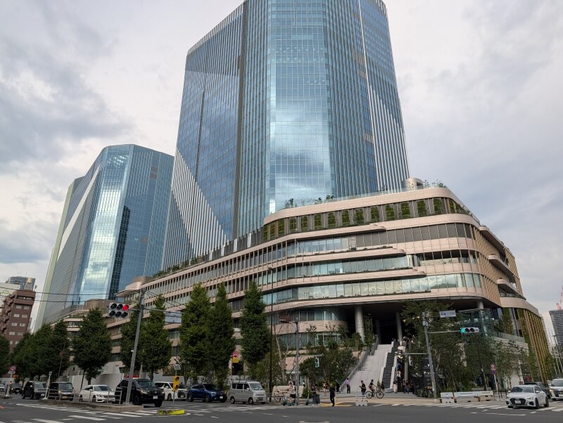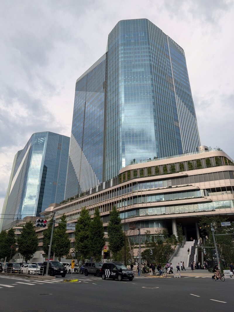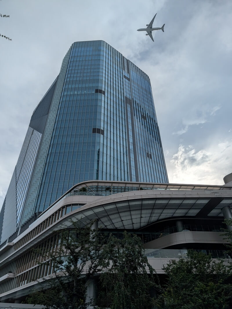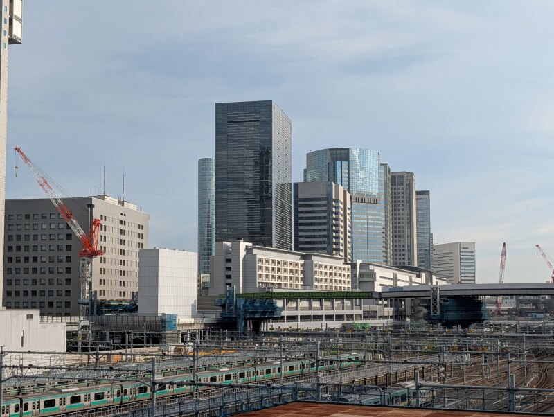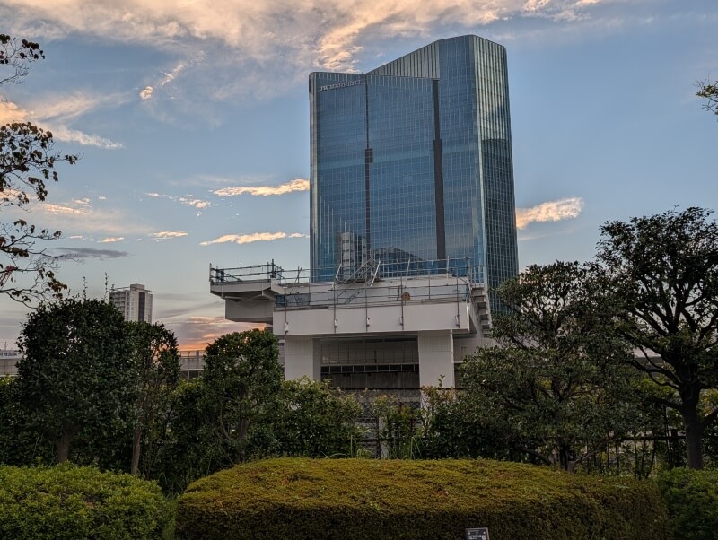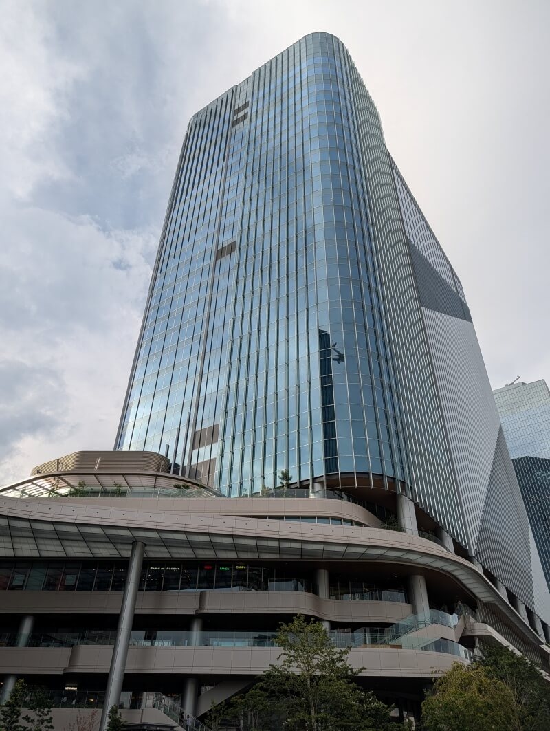 高輪ゲートウェイ駅前から、「THE LINKPILLAR 1 SOUTH」側を見上げた様子です。