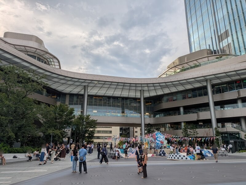 高輪ゲートウェイ駅の駅舎と、駅前広場を見た様子です。駅前に広場があるのは良いですね。