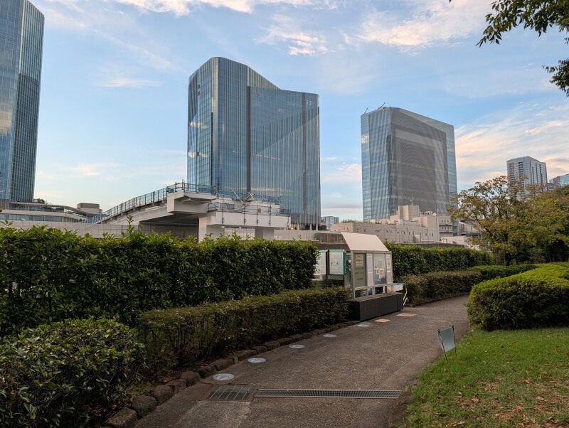 「芝浦中央公園」側から、東西自由通路の歩行者デッキが繋がりそうな付近を見た様子です。一瞬工事用の敷地かと思ったのですが、近づいて見ると喫煙所でした。