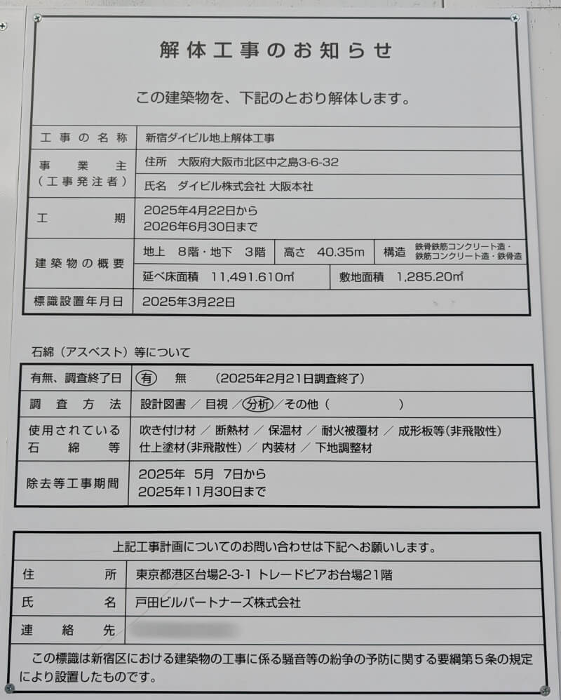 新宿駅東口にあった解体工事中の、「新宿ダイビル」(スタジオアルタ跡地)の様子です。解体工事中のパネルが設置されており、昔の姿が見えなくなってきていました。
