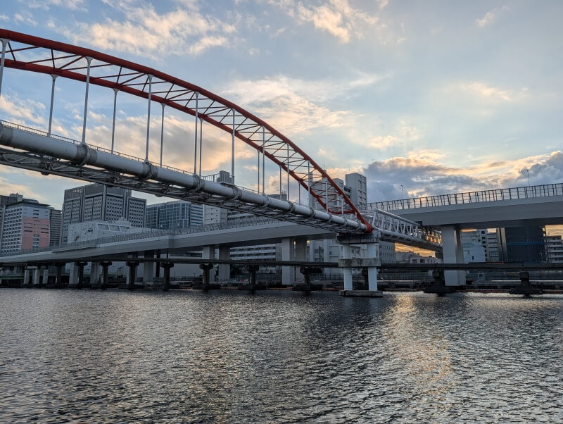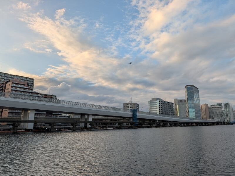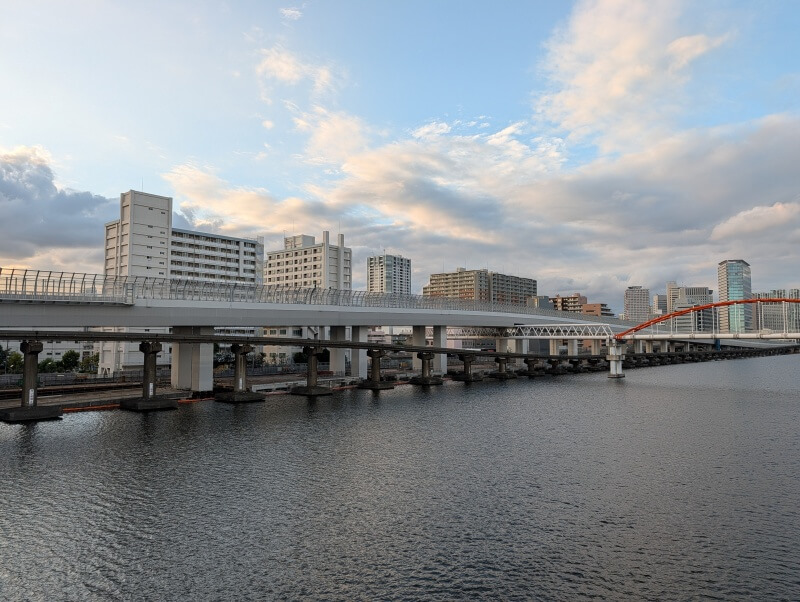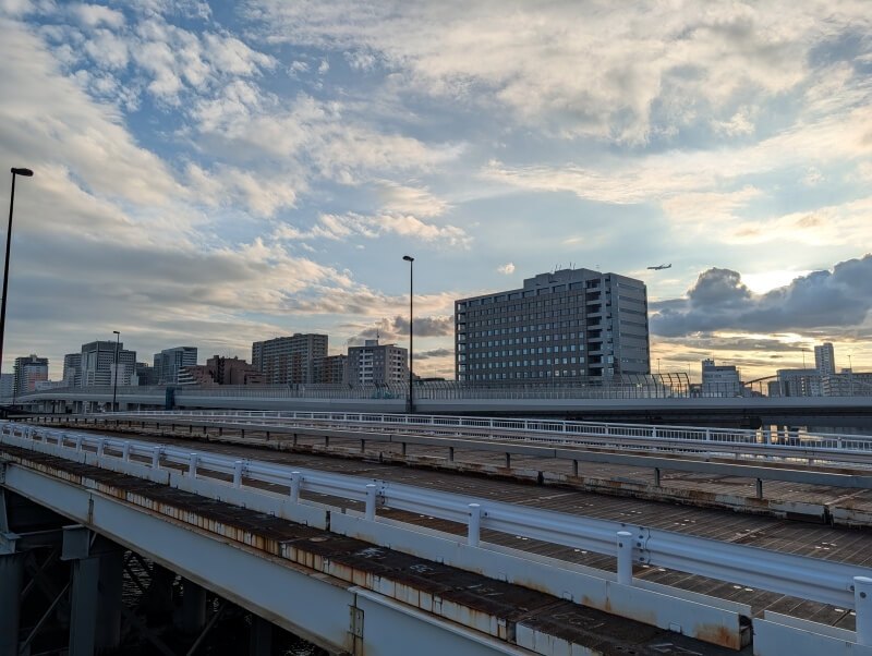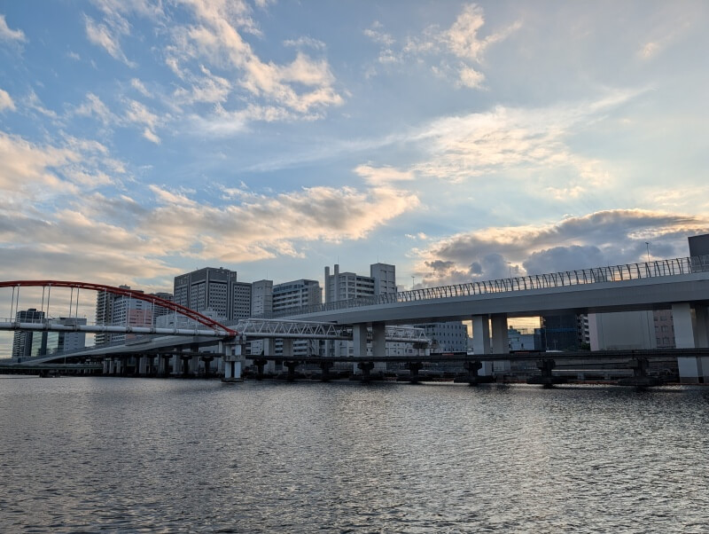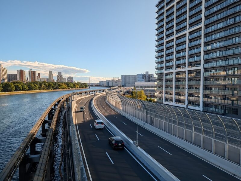 再び京浜運河沿いに移動して、首都高速湾岸線と「首都高速1号羽田線」が交わる個所を見た様子です。