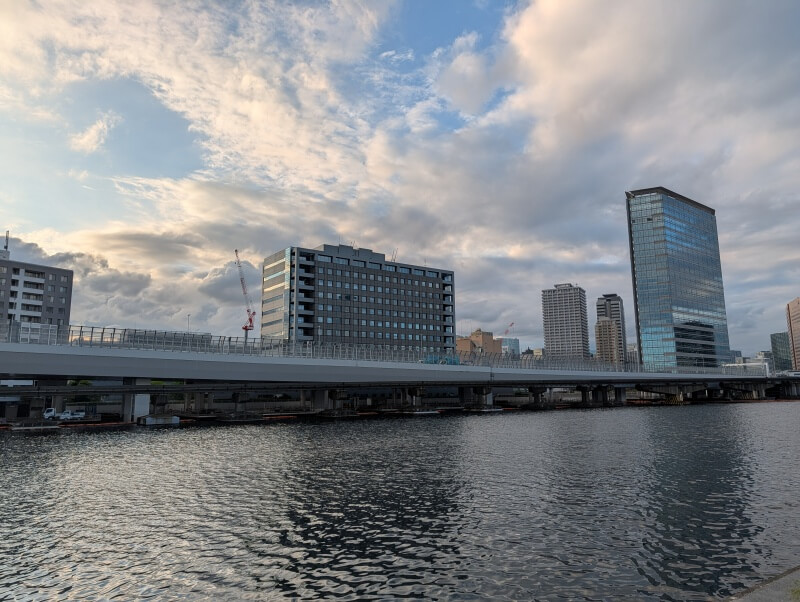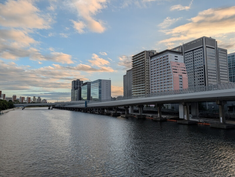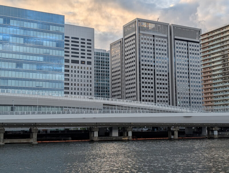 京浜運河沿いから、「首都高速1号羽田線」の北側、天王洲アイル側を見た様子です。
