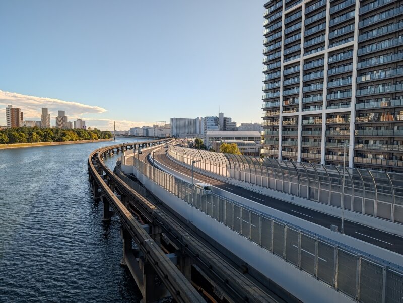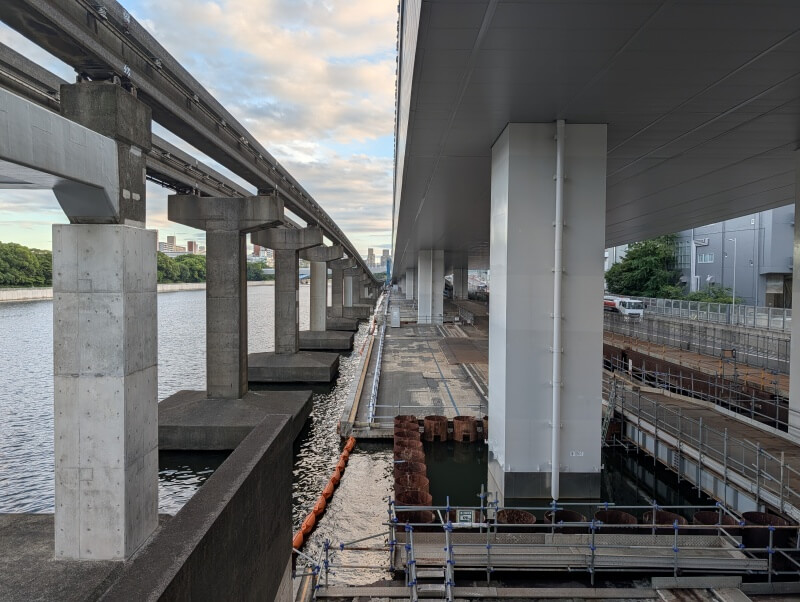 「首都高速1号羽田線」と、大井水管橋と、東京モノレールの軌道が重なり合う場所の様子です。複雑なインフラ同士が重なっている、ちょっとした萌えポイントだと思います。