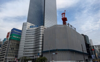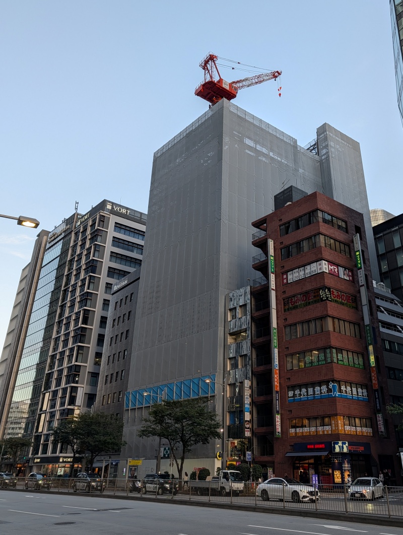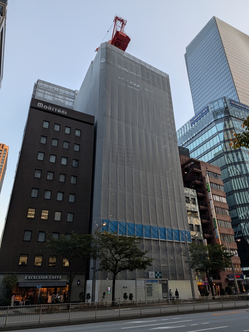 外堀通り沿いの、「ヤマダデンキ LABI東京八重洲」北側で施行中の、14階55m「(仮称)国分第二本社ビル新築計画」の様子です。