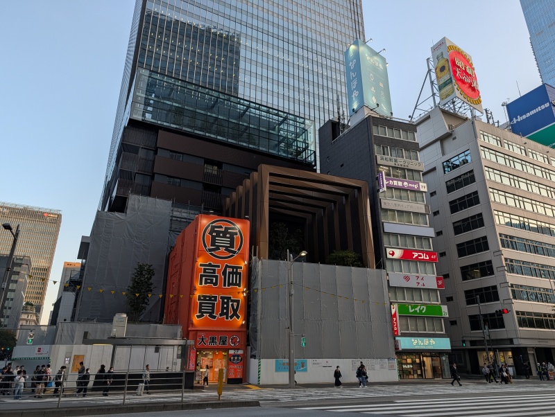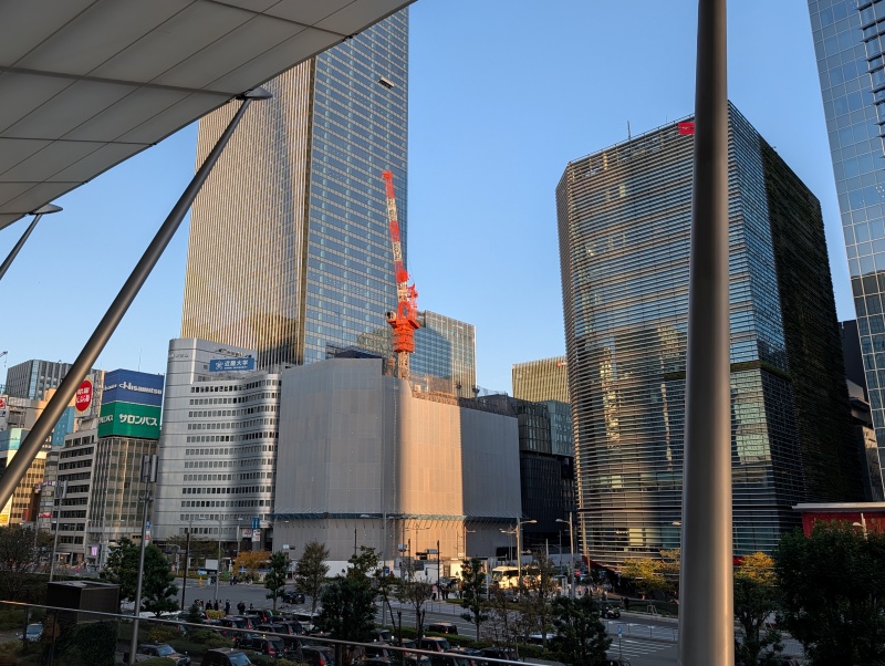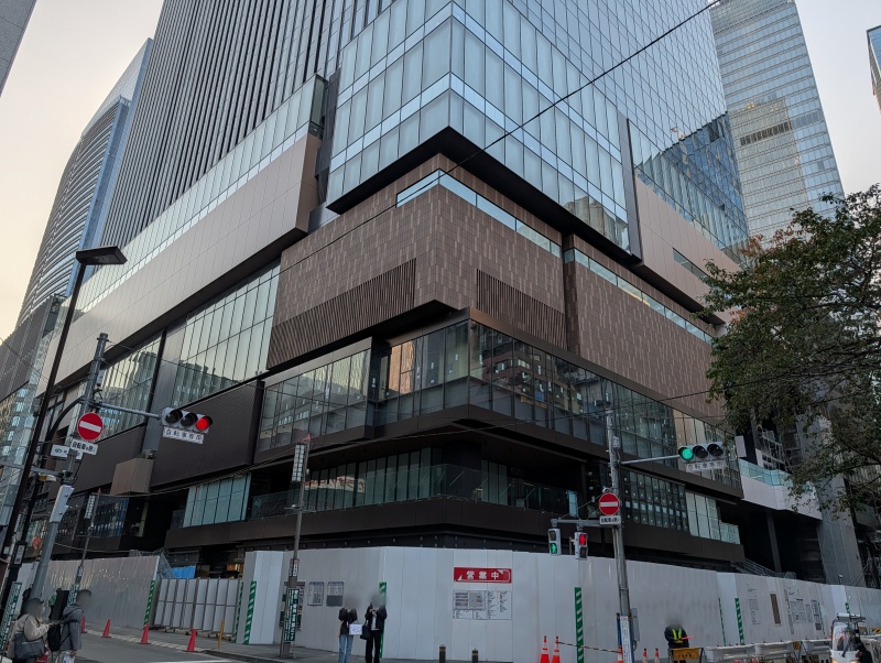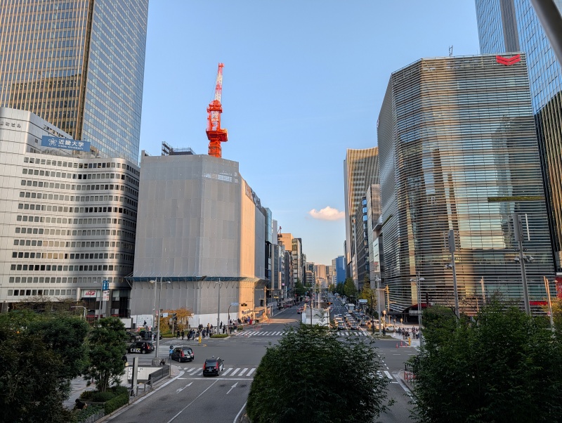 外堀通りと八重洲通りの交差点から、再開発の敷地低層階を見た様子です。