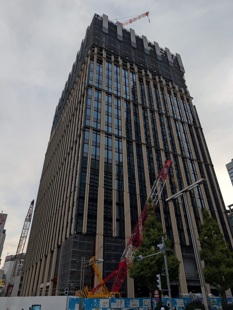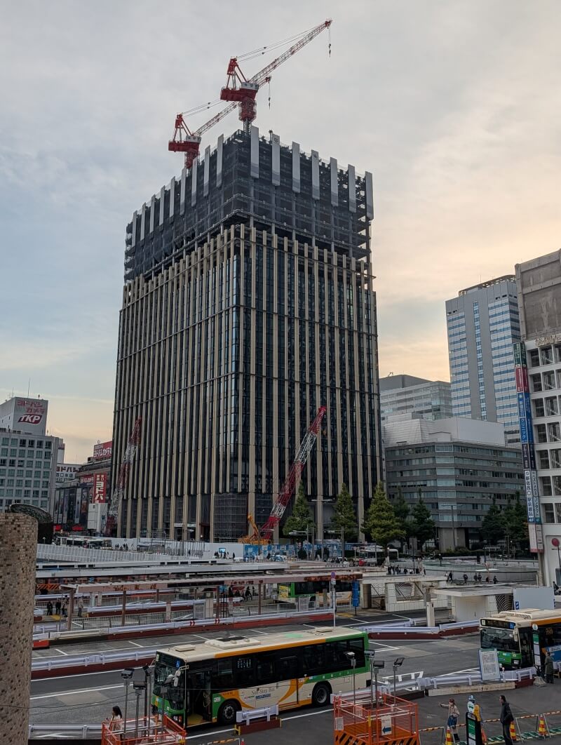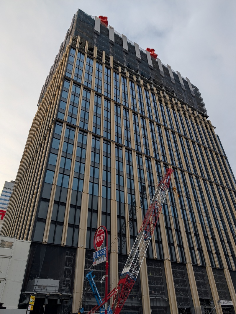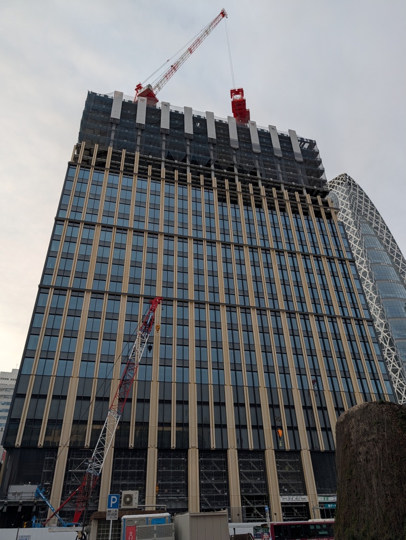 新宿駅西口の「明治安田生命新宿ビル」跡地で建替え工事が行われている、23階128m「(仮称)西新宿一丁目地区プロジェクト」の様子です。最高階付近を施工中でした。