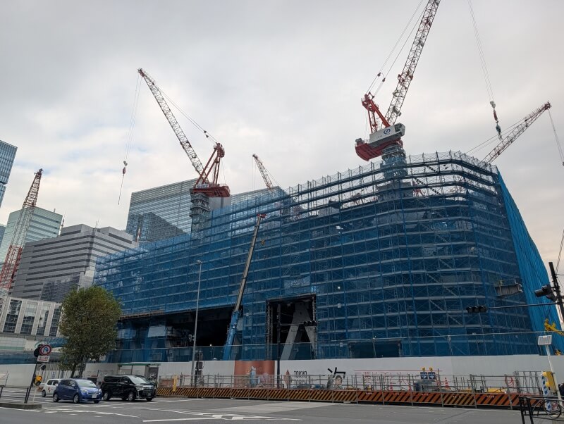 京王百貨店近くから見た、施行中の建物低層階の様子です。