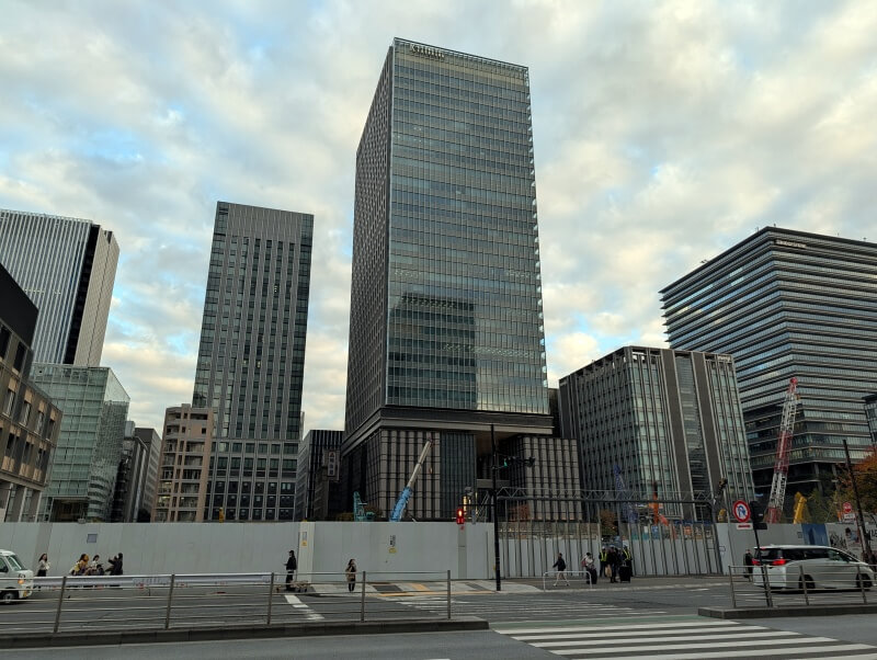 外堀通りと鍛冶橋通り交差点から、再開発の敷地を見た様子です。南側に地上部の鉄骨が出現していました。