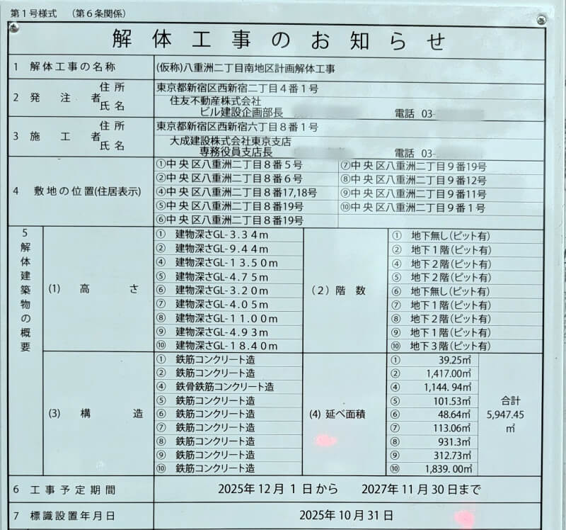現地に掲示されていた、解体工事のお知らせです。工事予定は、2025年12月1日~2027年11月30日までです。