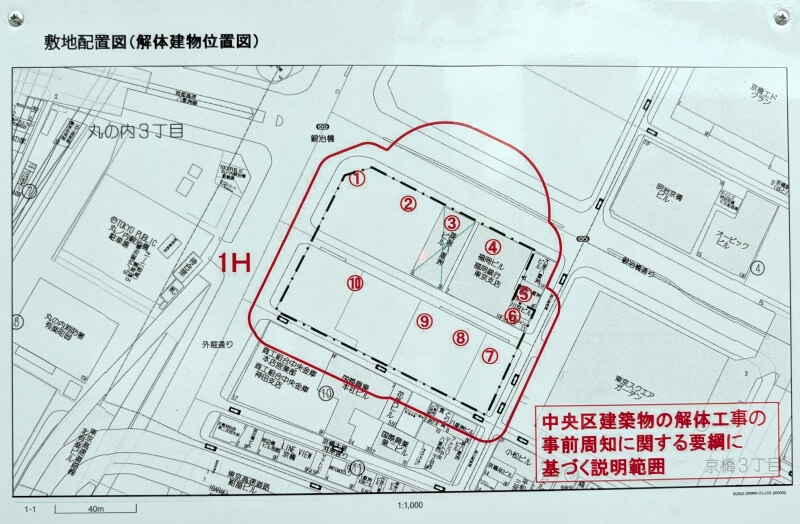 解体建物の敷地配置図です。「菱進八重洲ビル」の建物に、バツ(×)の印が記載されており、解体工事のお知らせの対象となってないのが気になりました。
